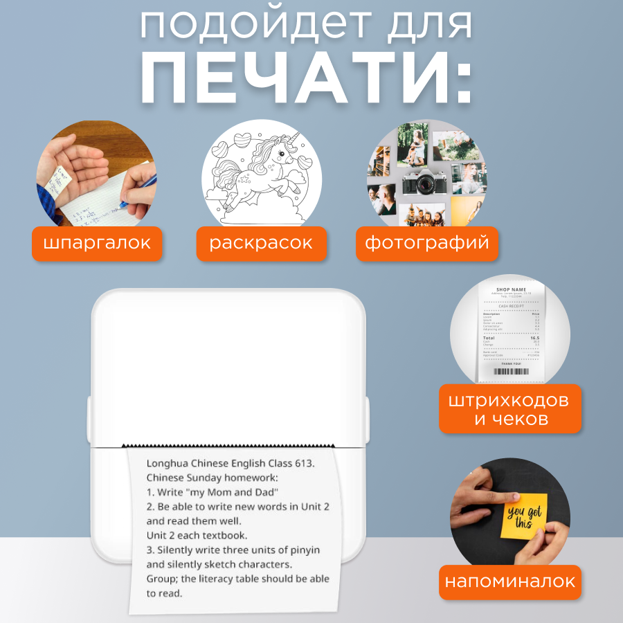 | Комплектация | Минипринтер, кабель для зарядки USB Type-C, инструкция на русском и английском языках, 1 рулон термобумаги, 1 рулон самоклейки |