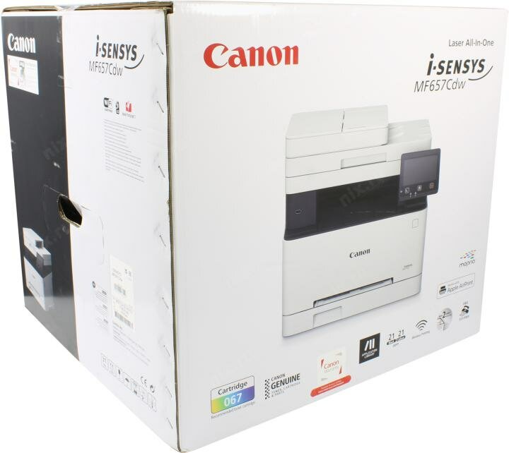 | Комплектация | МФУ лазерное Canon i-SENSYS MF657Cdw; стартовые картриджи 067; руководство по эксплутатации; диск с ПО; кабель питания; гарантийный талон |