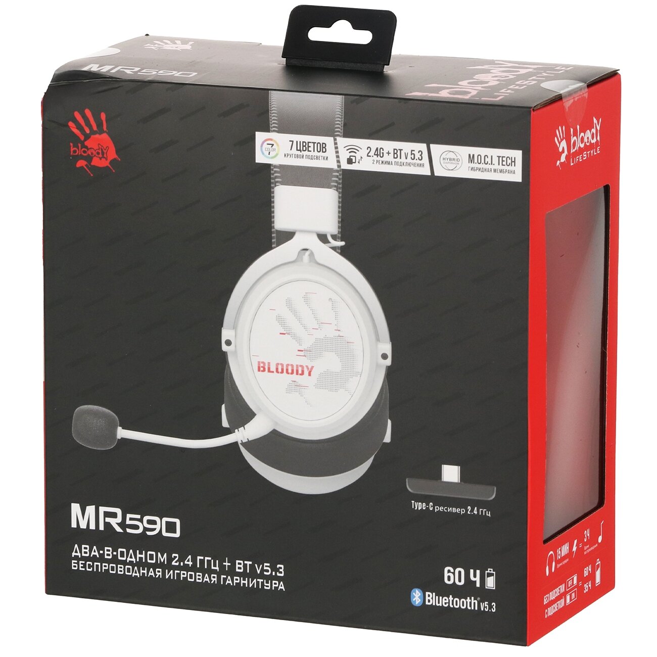 Гарнитура игровая A4TECH Bloody MR590 Sports, для компьютера и игровых консолей, мониторные, беспроводные bluetooth/радио/3,5 mm, белый / черный [mr590+ wired/sport white]