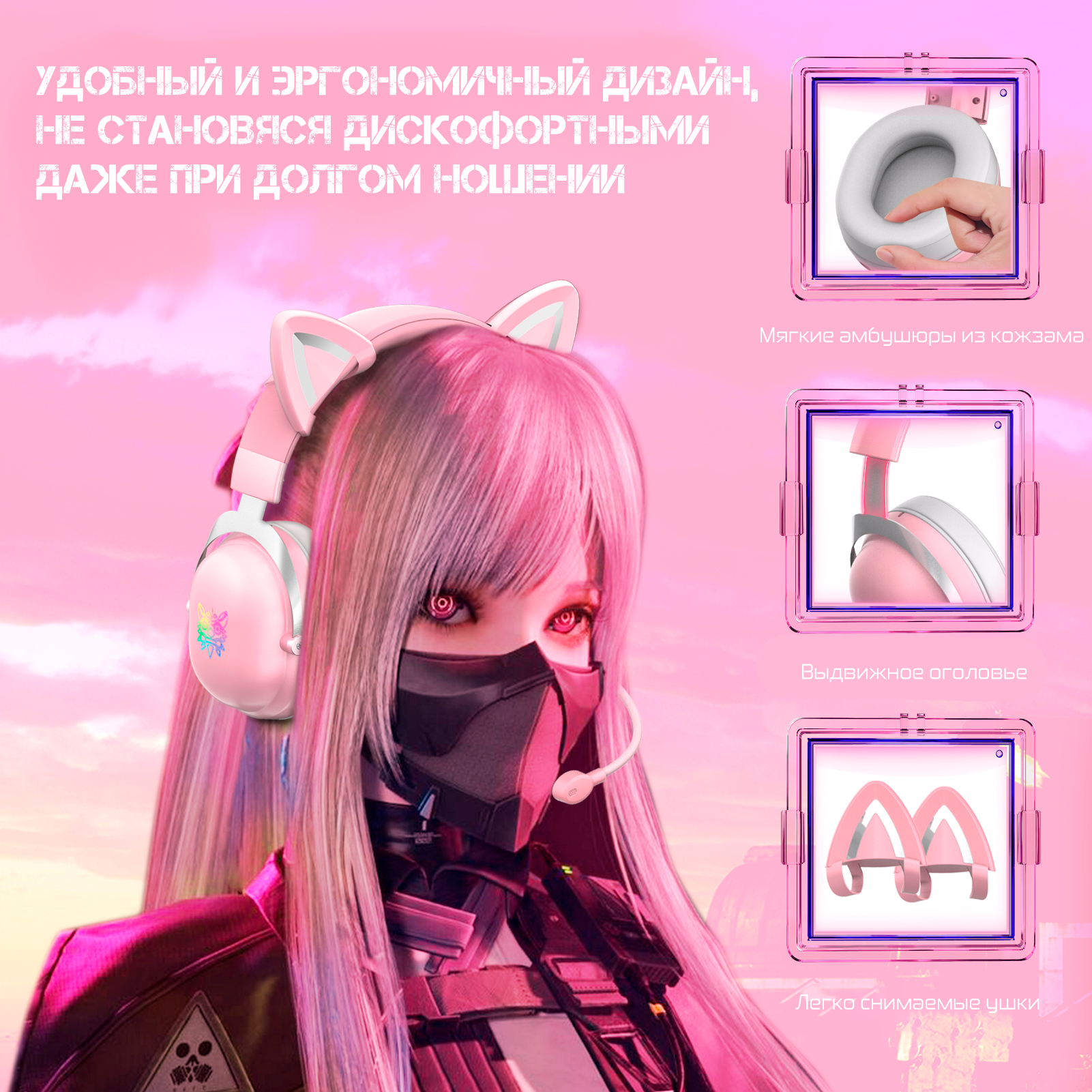 Купить Игровые наушники Onikuma X11 Rose Cat розовые с кошачьими ушками и подсветкой