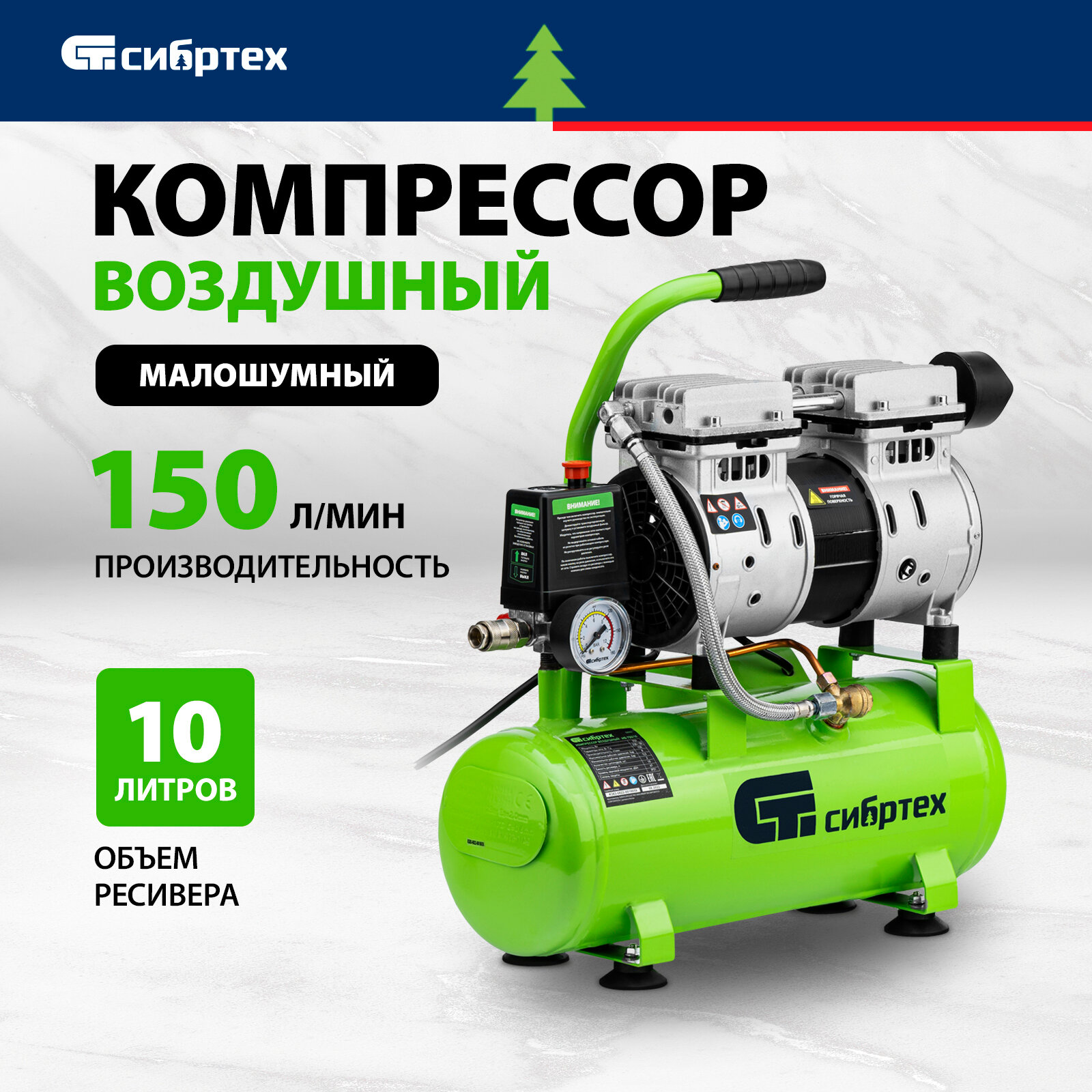 Компрессор воздушный 10л безмасляный Сибртех МБ 750/10, 750 Вт, 150 л/мин, малошумный, прямой привод, 58001
