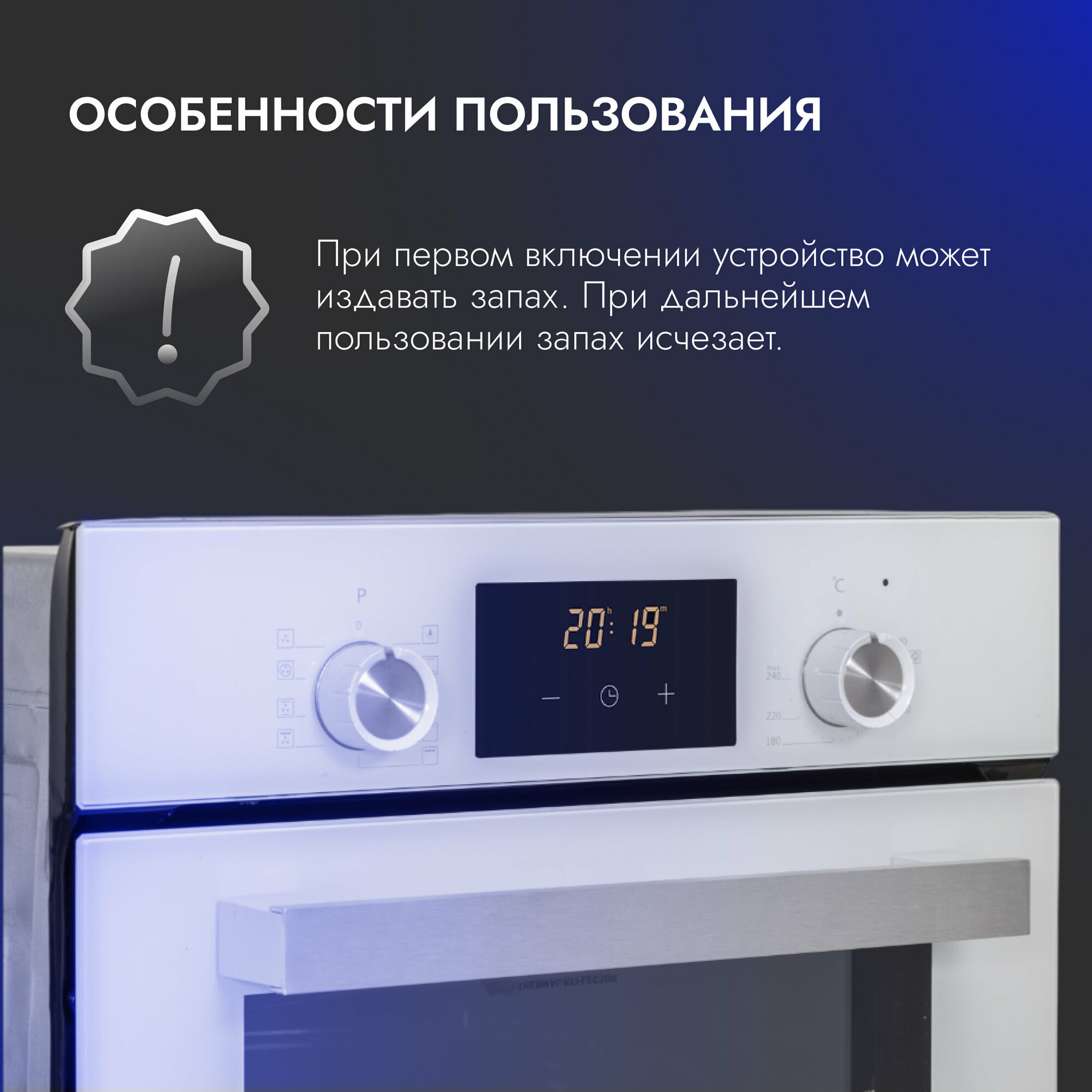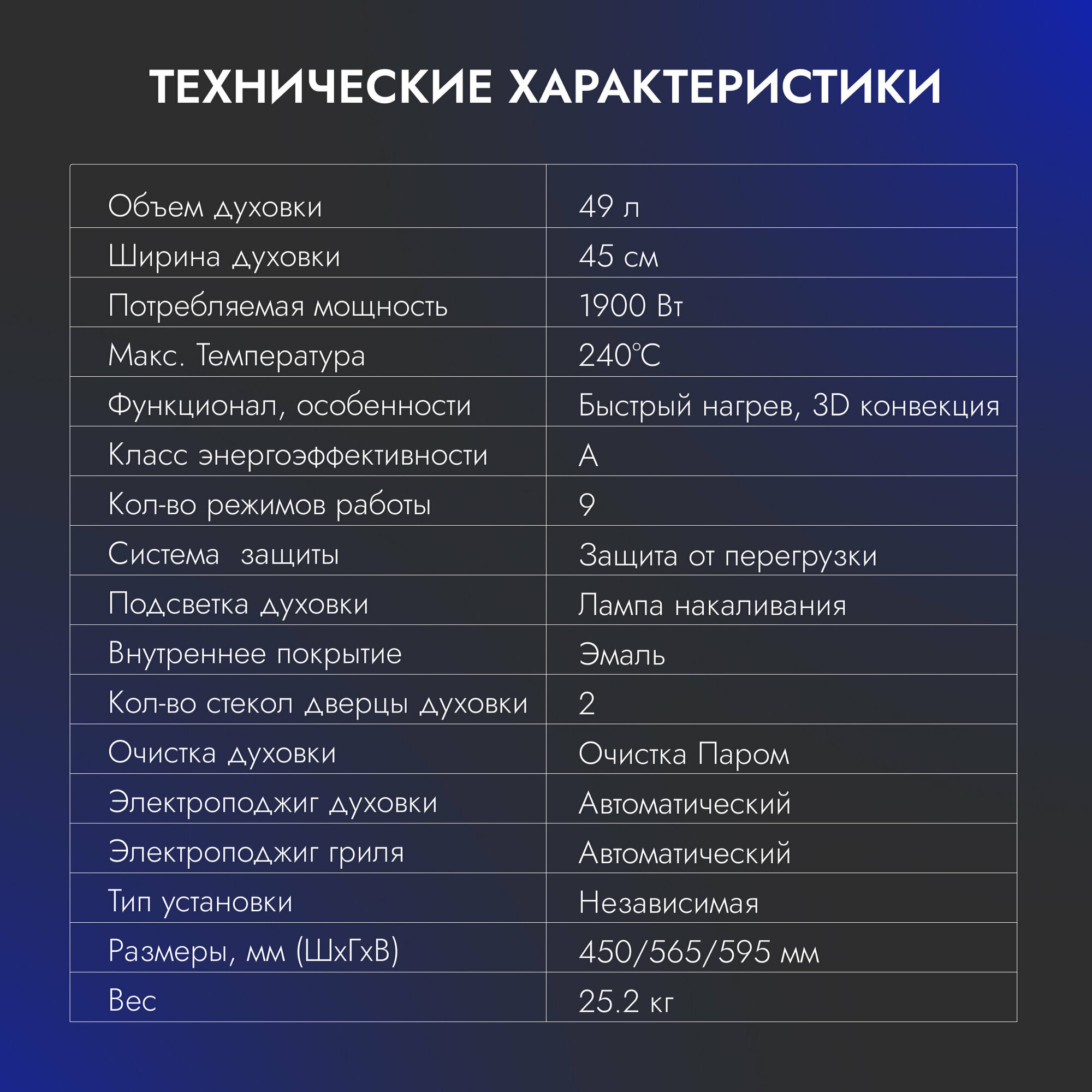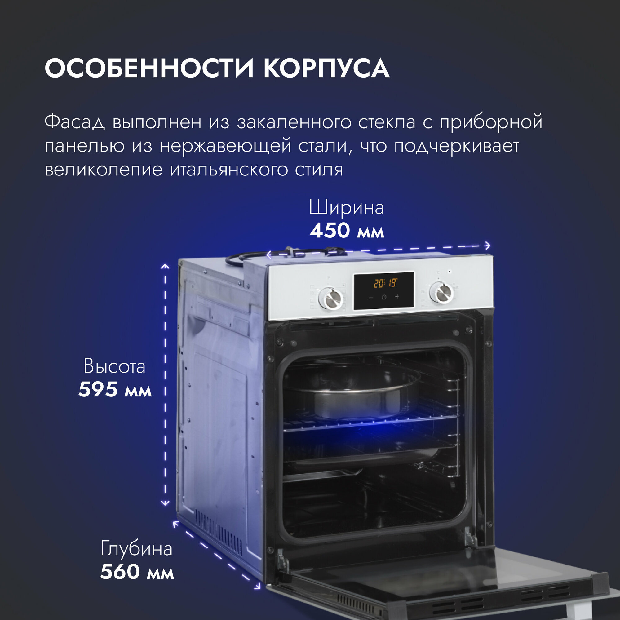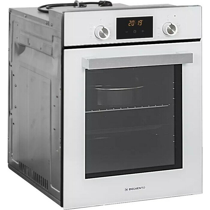 Духовой шкаф электрический встраиваемый 45см белый / 9 режимов (гриль + конвекция) DELVENTO V4EC59001 / стеклянный фасад / дисплей, цифровой таймер, часы / пароочистка / двойное стекло LOW-E / подсветка / хром. решетка и 2 противня: стандартный + круглый интересное: