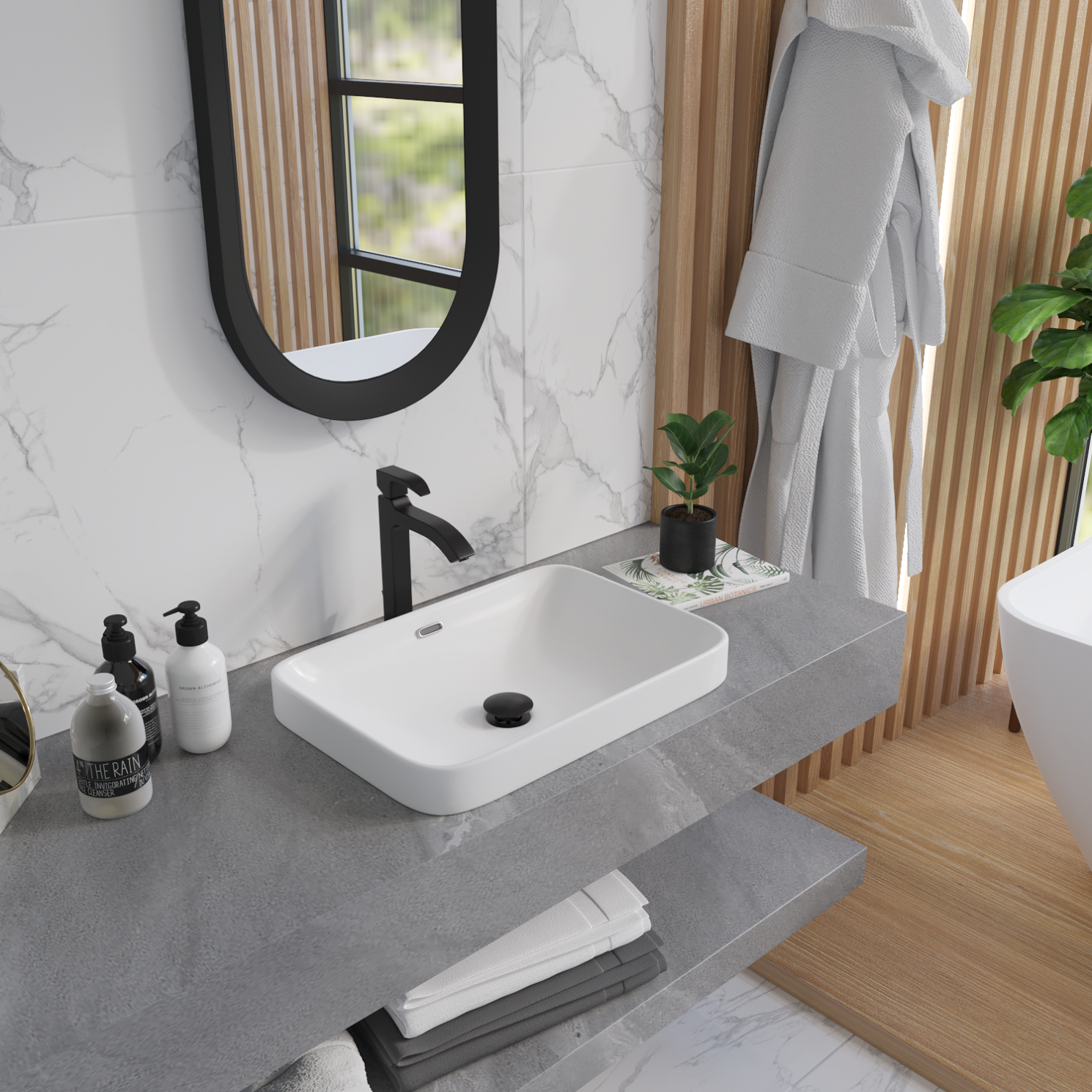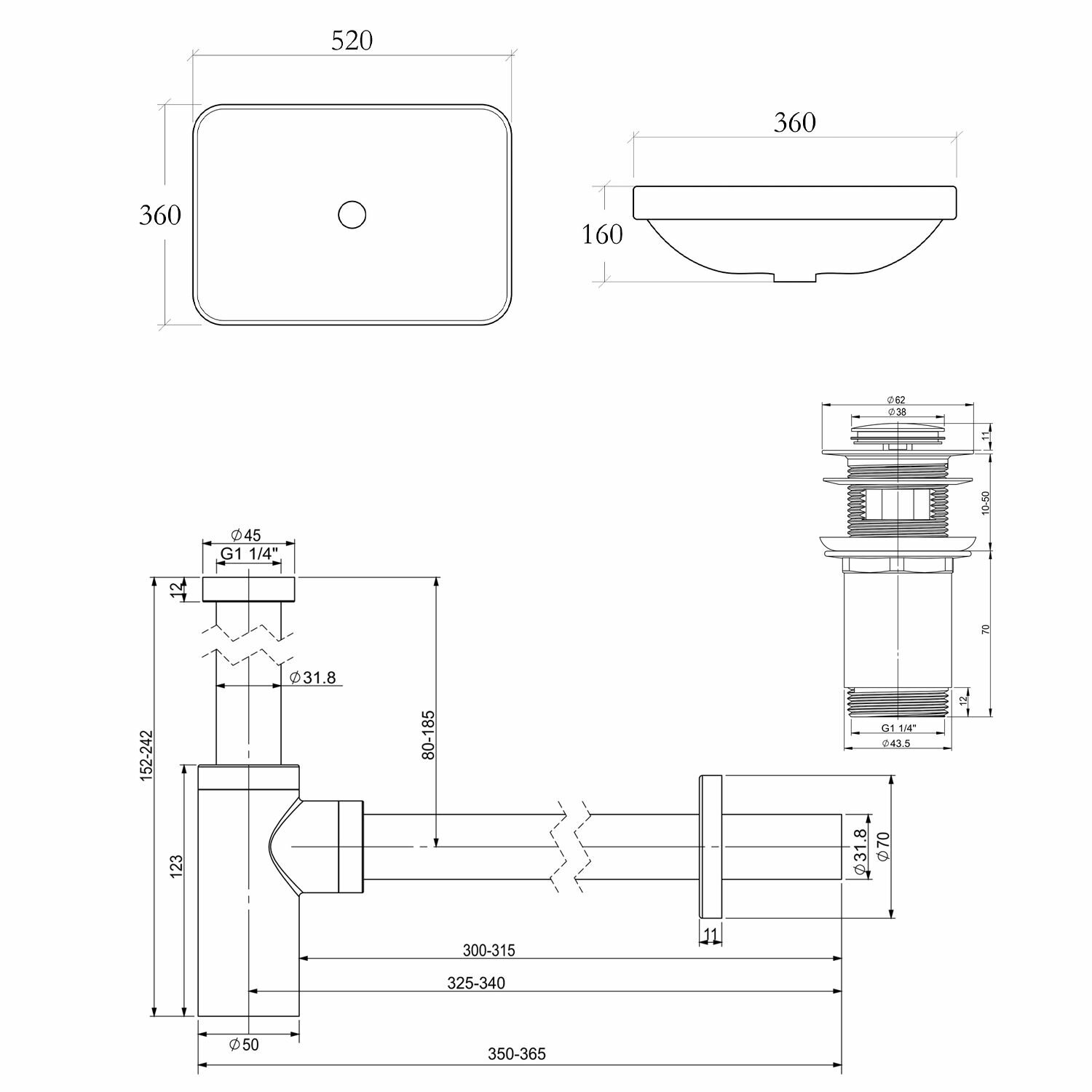 Встраиваемая раковина в ванную Helmken 44152000 комплект 3 в 1: умывальник прямоугольный 52 см, сифон и донный клапан click-clack в цвете черный