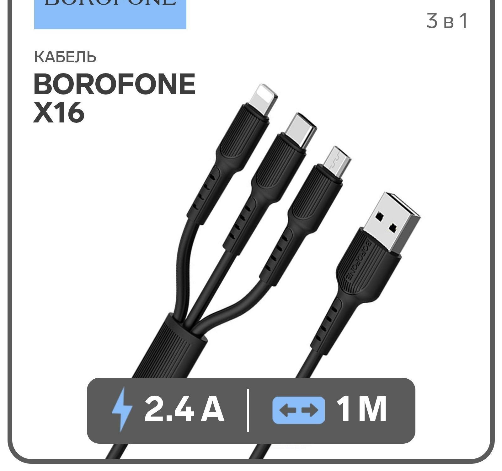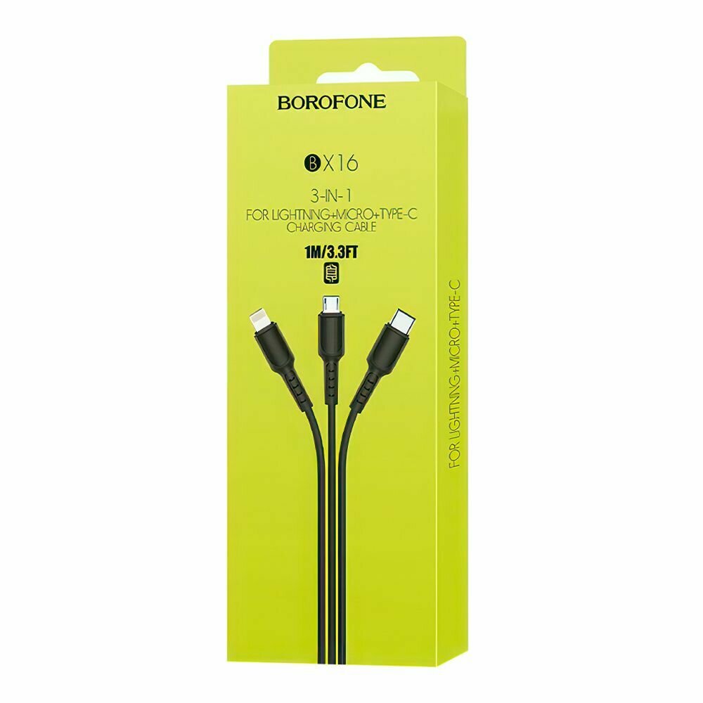 Borofone Кабель Borofone X16, 3 в 1 Lightning/microUSB/Type-C, 2.4 А, 1 м, TPE оплётка, чёрный