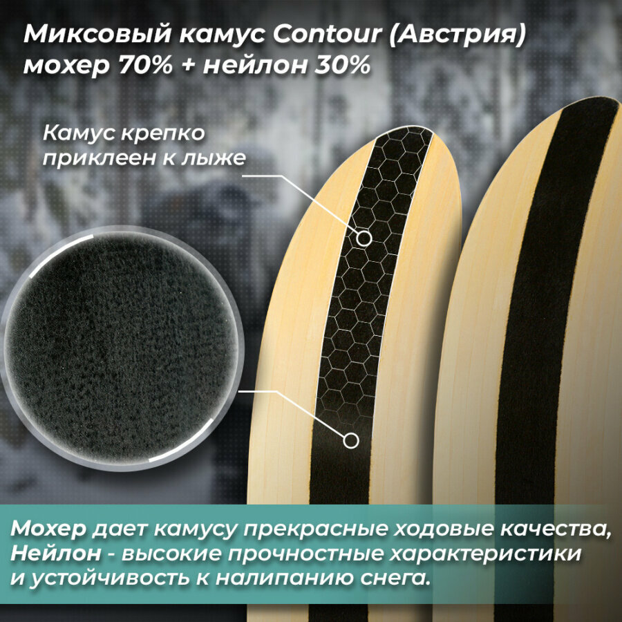 | Дополнительная информация | Модель лыж имеет скользящую поверхность, на которую наклеена полоса искусственного камуса шириной 60 мм фирмы Контур (Австрия) |