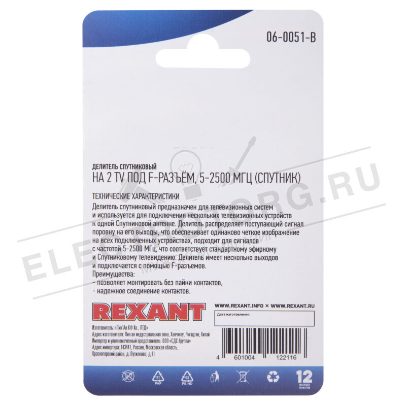 Разветвитель антенный Rexant 06-0051-B спутниковый F-типа на 3 TV, 5-2500 МГц интересное: