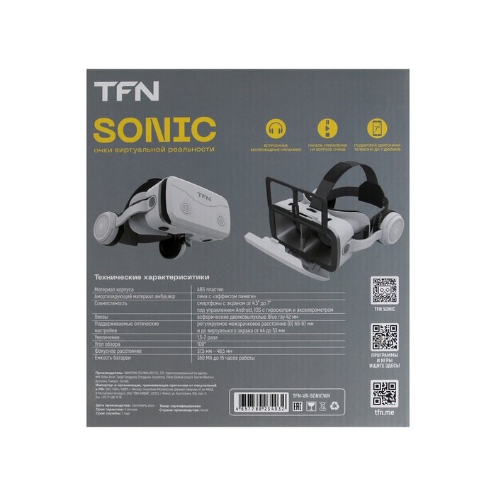 TFN 3D Очки виртуальной реальности TFN SONIC, смартфоны до 7", 350 мАч, беспроводные, белые интересное: