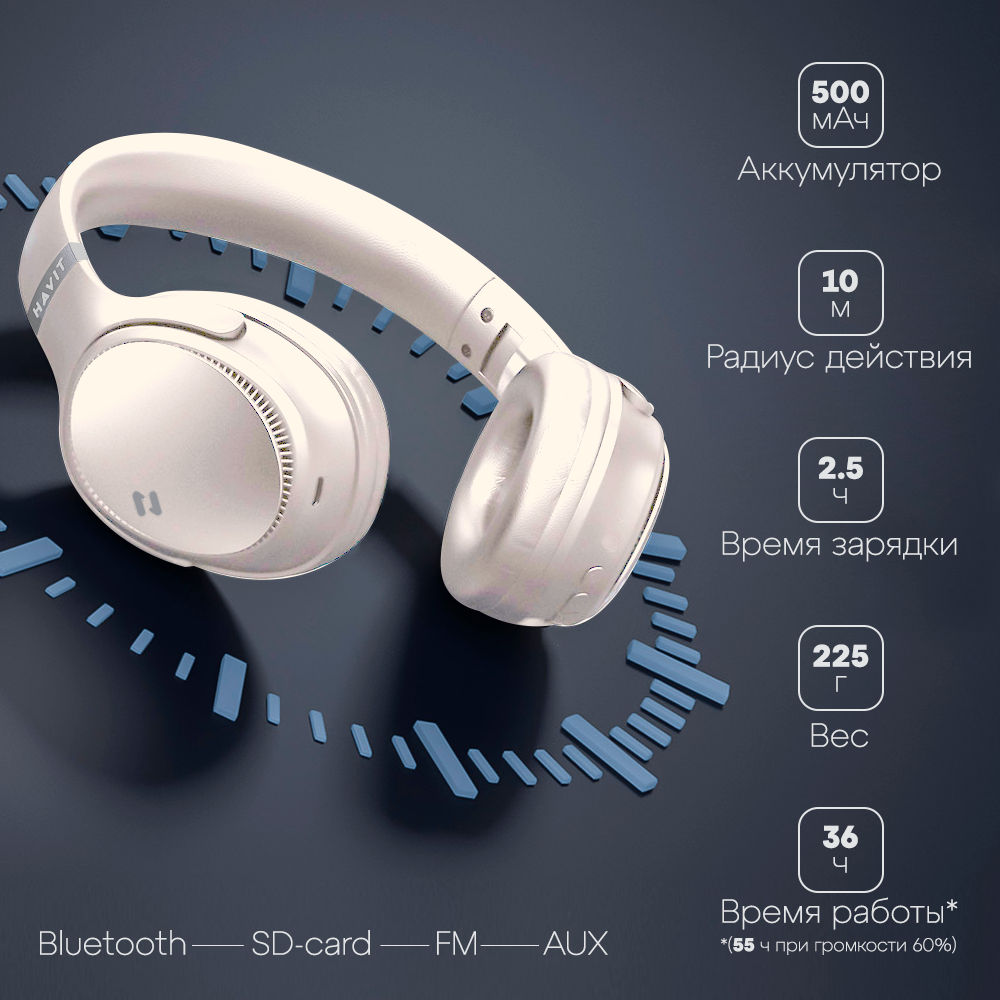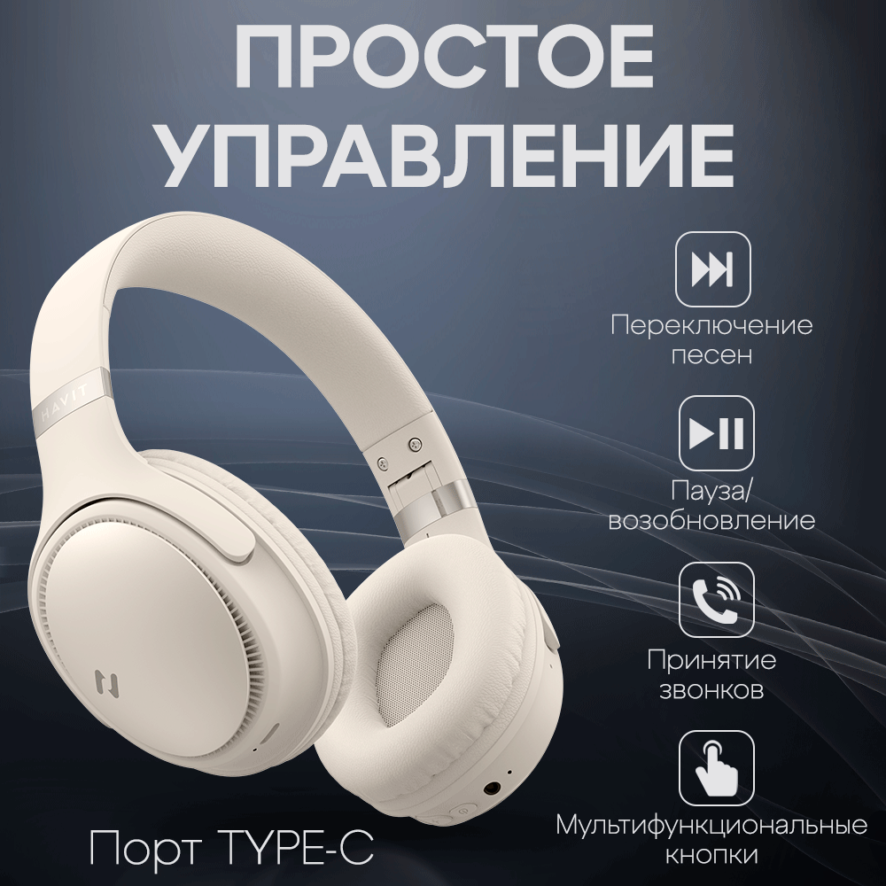 Наушники беспроводные HAVIT H655BT с микрофоном, активным шумоподавлением, увеличенным временем работы, игровые, бежевые