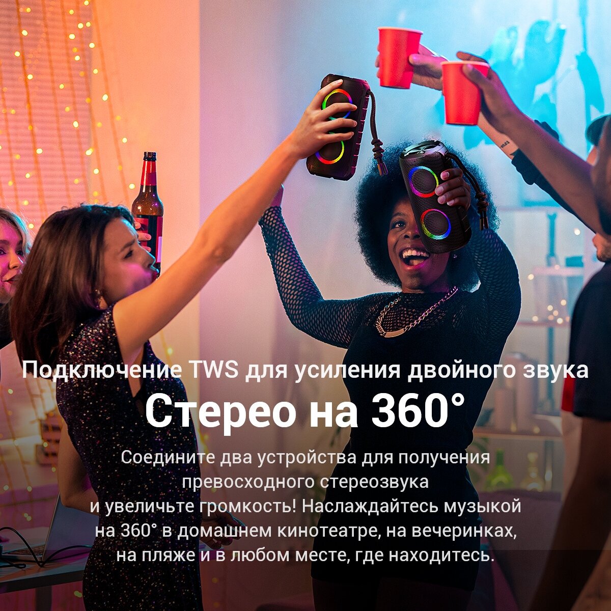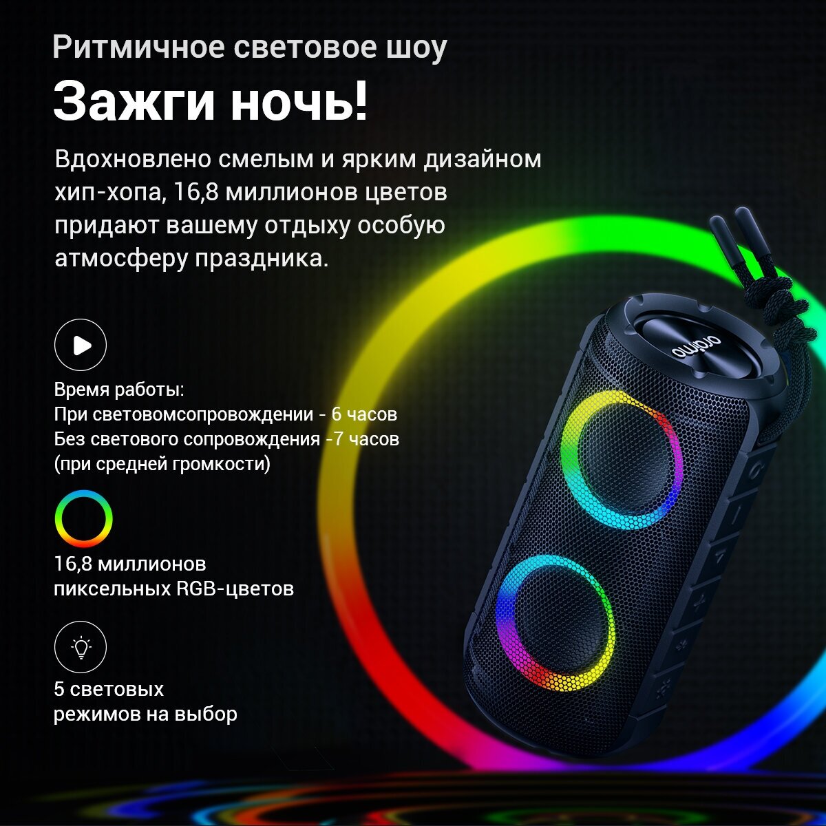 | Особенности | FM-радио / влагозащищенный корпус / световые эффекты |