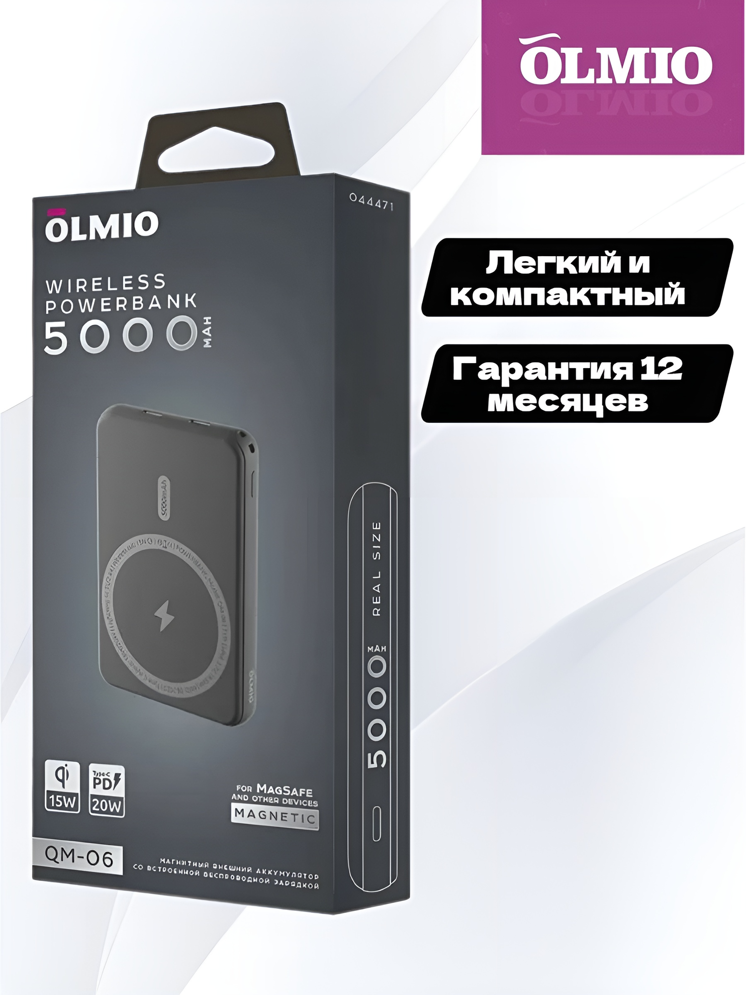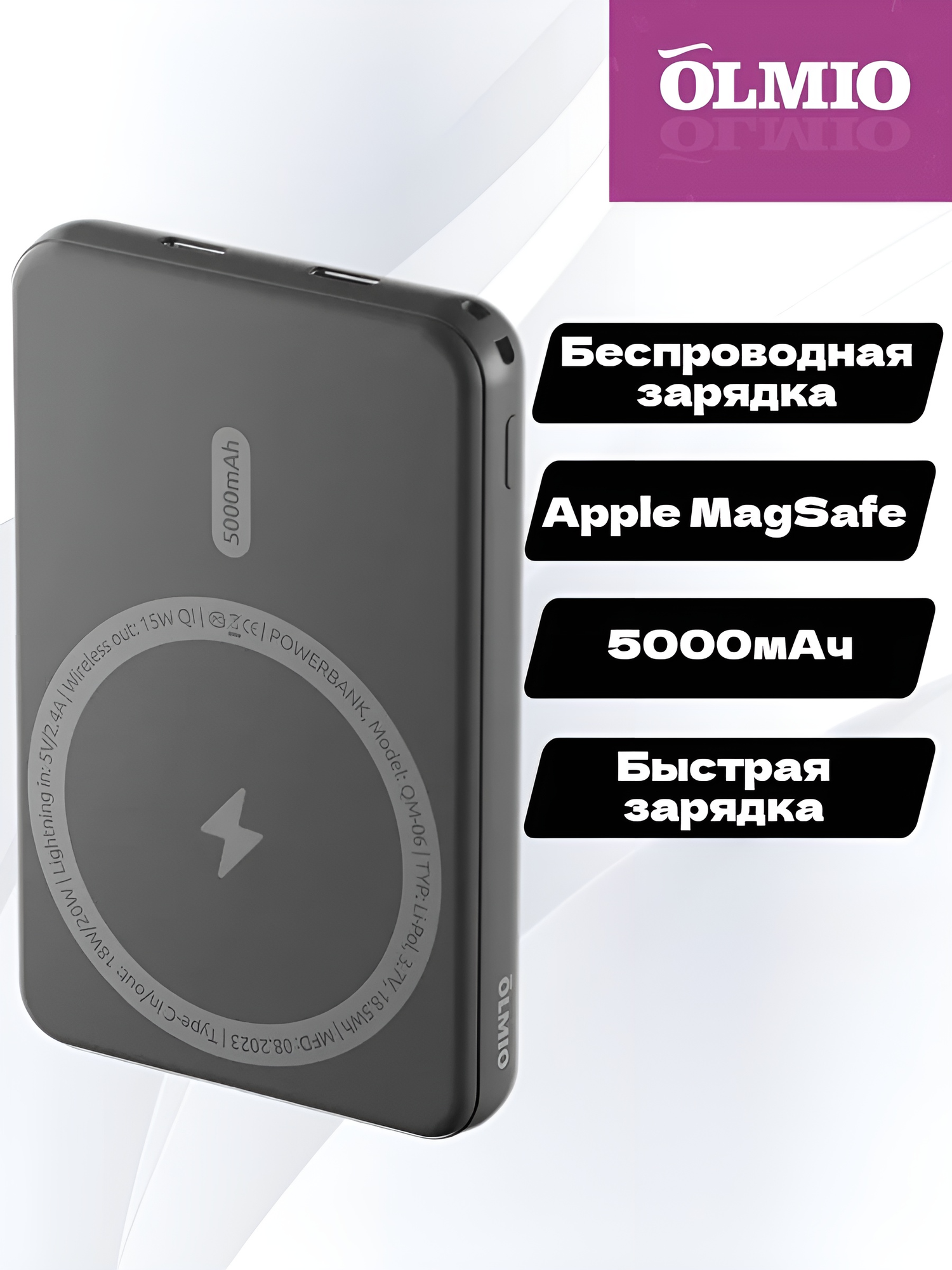 Внешний аккумулятор OLMIO QM-06, 5000mAh с магнитной беспроводной зарядкой 15W, MagSafe, черный