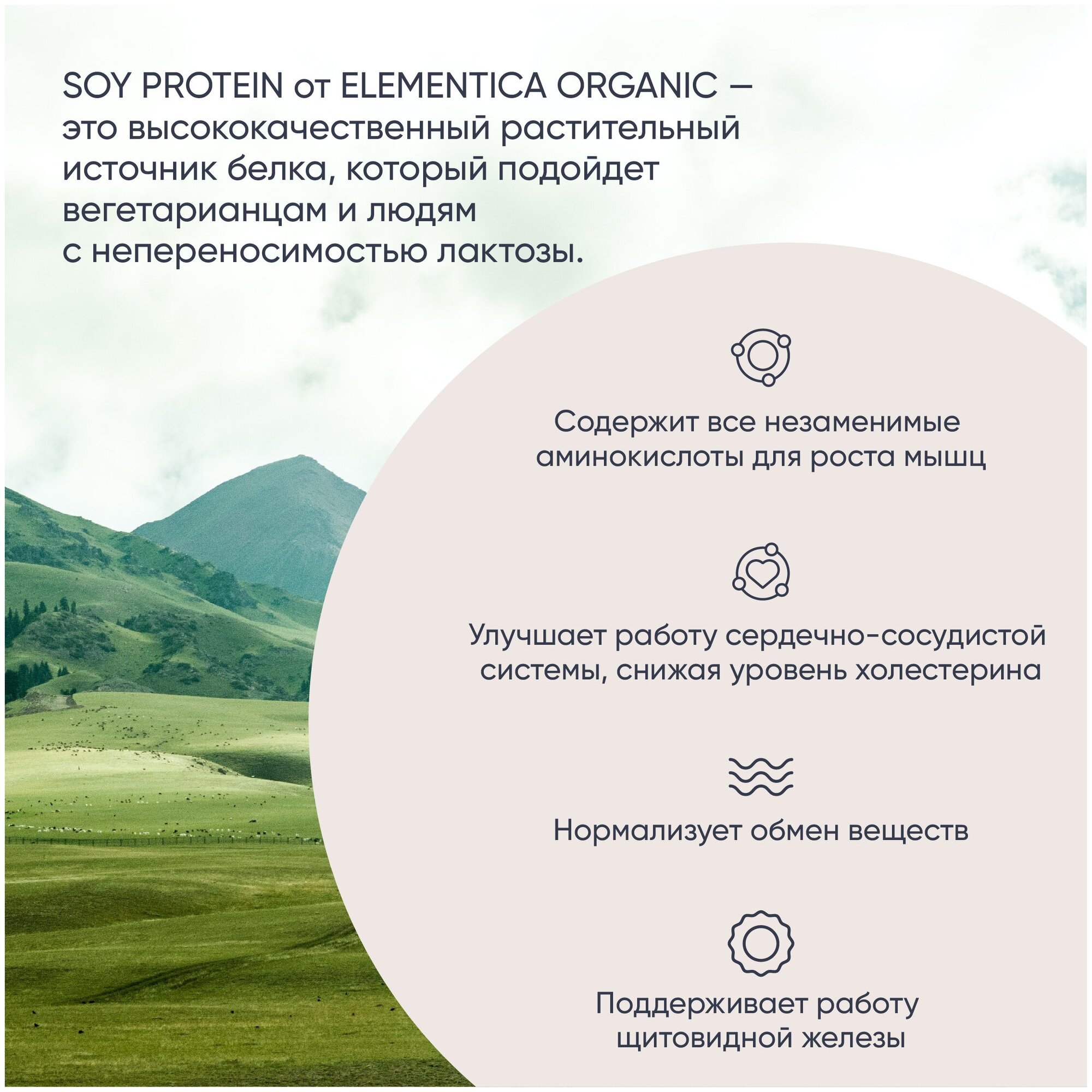 | Дополнительная информация | Соевый протеин, веган протеин, веганский протеин, изолят соевого белка, без сахара, без лактозы, без ГМО; рекомендации по применению: Смешайте порцию порошка (30г) с 200-250 мл холодной воды (для смешивания рекомендуется использовать спортивный шейкер). В силу специфики растительных белков, коктейль может быть густым. В этом случае добавьте больше жидкости.; размер порции в г(мл): 30; состав: Изолят соевого белка, мальтодекстрин, полидекстроза, алкализованный какао-порошок (только для вкуса «Шоколадный десерт»), ароматизатор (в соответствии со вкусом), соль поваренная пищевая (только для вкуса «Шоколадный десерт»), регулятор кислотности (лимонная кислота — только для вкуса «Ягодный микс»), эмульгатор (лецитин соевый), смесь подсластителей (ацесульфам калия, сукралоза). |
