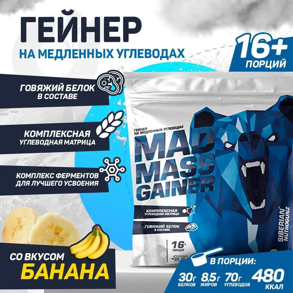 Гейнер для набора массы Siberian Nutrogunz Mad Mass Gainer, банан, 2000 гр.