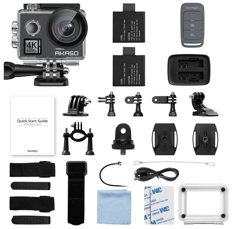 | Комплектация | 1x AKASO V50 Elite Action Camera, 1x Пульт управления, 2x 1050 мАч аккумулятора, 1x Влагозащитный чехол, 1x ЗУ для аккумуляторов, 1x Крепление для велосипеда, 6x различных креплений, 2x 2-х сторонняя клейкая лента, 2x Крепления для шлема, 1x Ремешок, 5x Стяжки, 1x Защитная задняя крышка, 1x USB-C кабель, 1x Тряпочка для протирки линзы, 1x Quick Reference Guide |