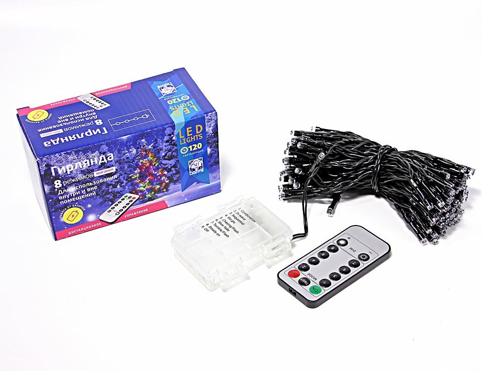 Светодиодная гирлянда на батарейках 120 разноцветных LED ламп 12 м, черный ПВХ, контроллер, пульт управления, IP44, SNOWHOUSE LD120-GM-BO-RC