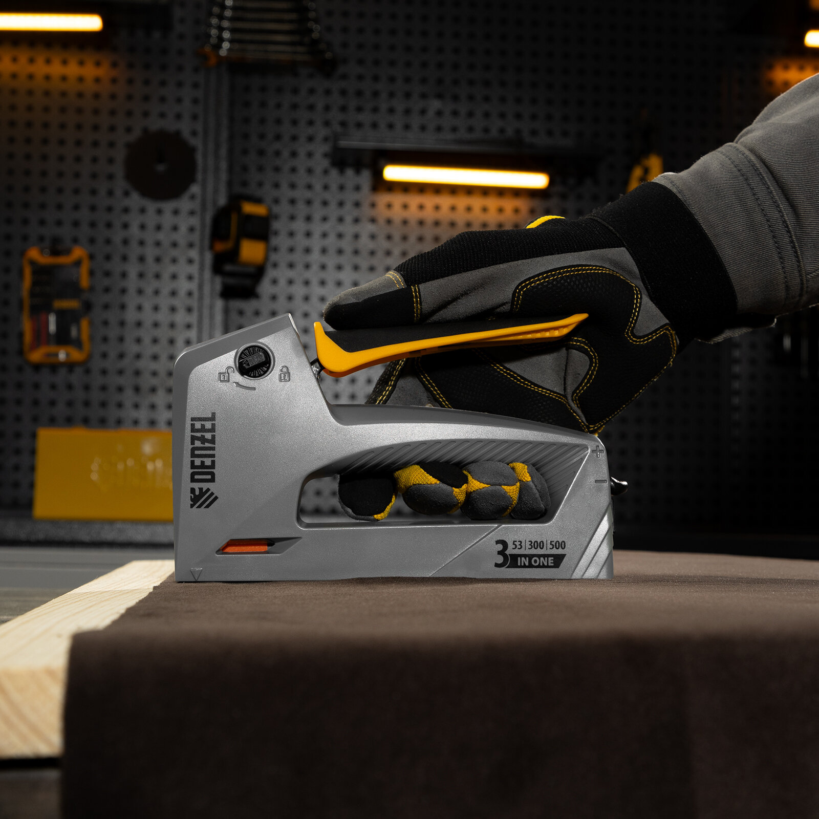 Степлер мебельный, пластиковый корпус, тип 53, 6-14 мм, тип 300, 15 мм, тип 500, 15 мм// Denzel 4021 .