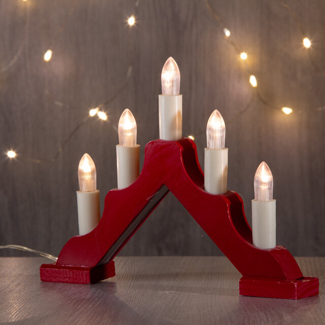 Свечи на красной деревянной подставке - горке, 5 теплых белых LED-огней, 20х17 см, батарейки, SNOWHOUSE BIE1205