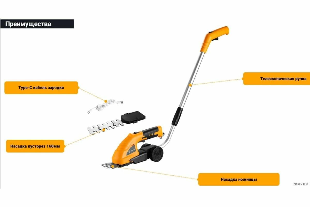 | Комплектация | ножницы садовые, насадка для стрижки травы, насадка-кусторез, зарядное устройство |