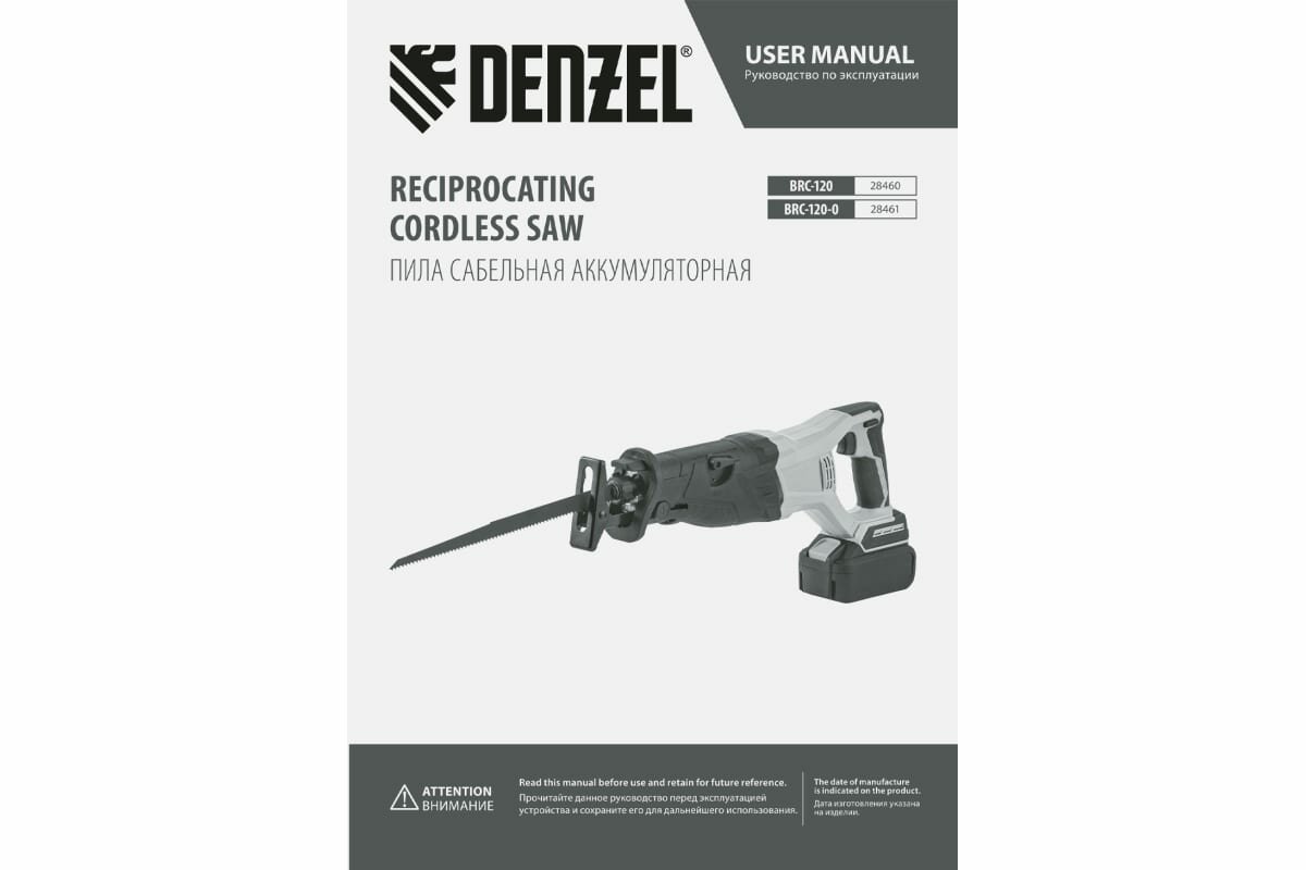 DENZEL 28461 Пила сабельная аккумуляторная бесщет BRC-120-0, 18В Li-Ion Denzel 28461