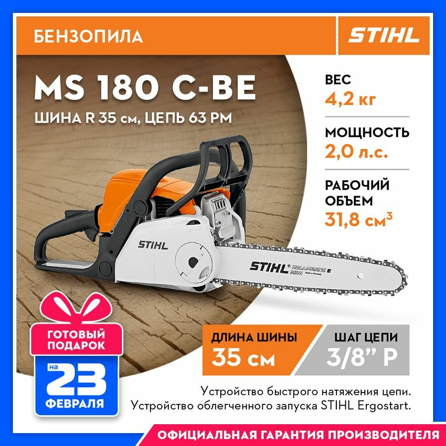 | Комплект поставки | Бензопила Stihl MS 180 С - 1шт, Шина Stihl 35 см - 1 шт, Цепь 63PMC50 Stihl 50 звеньев - 1 шт, ключ для свечи - 1 шт, ключ натяжки цепи - 1 шт, кожух на шину - 1 шт, инструкция - 1 шт |
