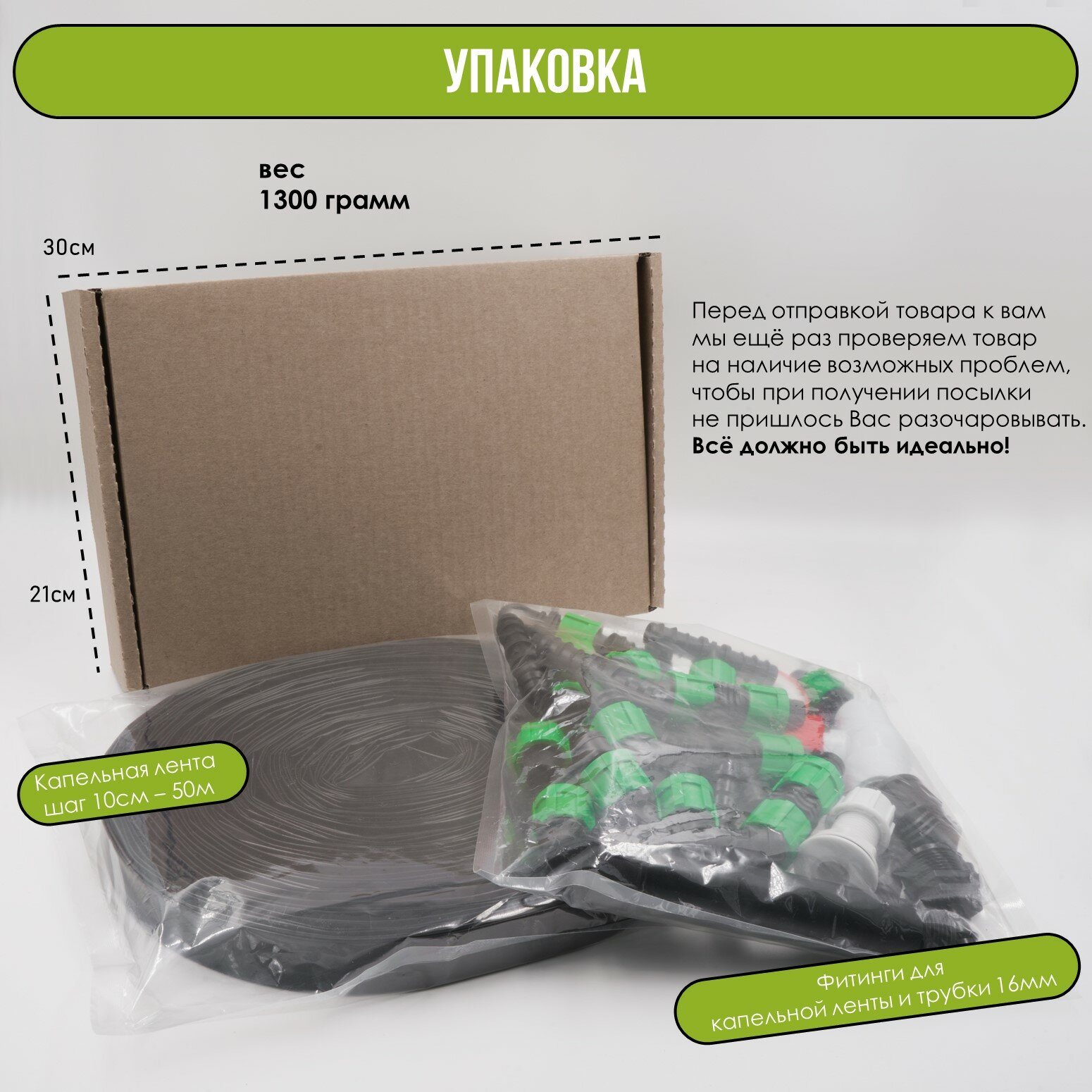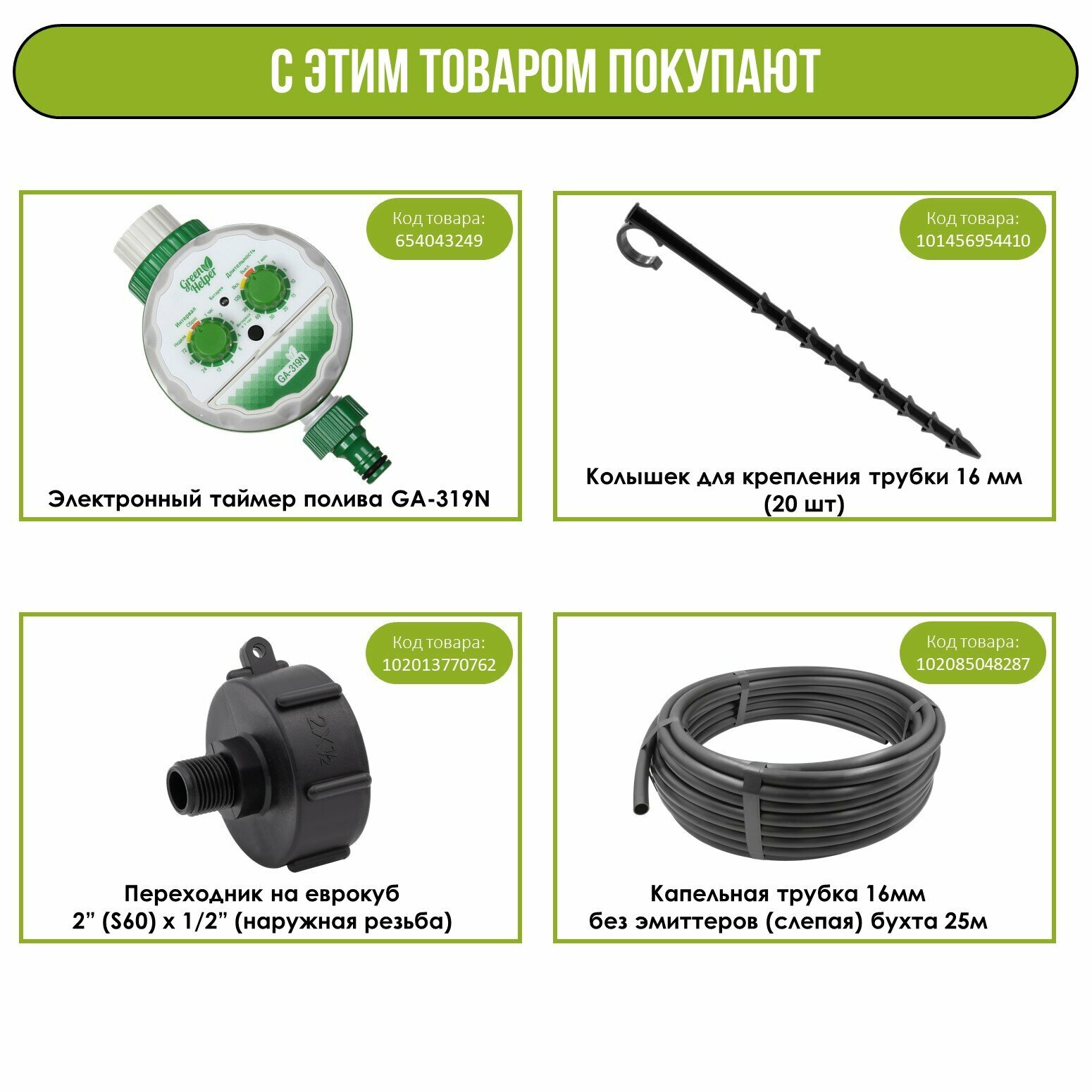 | Комплектация | 1. Врезка 1/2" - 1шт;2. Кран шаровый 1/2" - 1шт;3. Муфта Г-образная 1/2" - 1шт;4. Муфта 16мм х 3/4" наружная - 1шт;5. Фильтр сетчатый 3/4" - 1шт;6. Муфта 16мм х 3/4" внутренняя - 1шт;7. Уголок для трубки или шланга 5/8" - 2шт;8. Тройник для трубки или шланга 5/8" - 1шт;9. Заглушка для трубки или шланга 5/8" - 2шт;10. Тройник для трубки или шланга 5/8" с поджимной гайкой для подключения капельной ленты - 6шт;11. Заглушка с поджимной гайкой для подключения капельной ленты - 6шт;12. Ремонтный соединитель с поджимной гайкой для подключения капельной ленты - 2шт;13. Капельная лента - 50м;14. Фум лента - 1шт; |