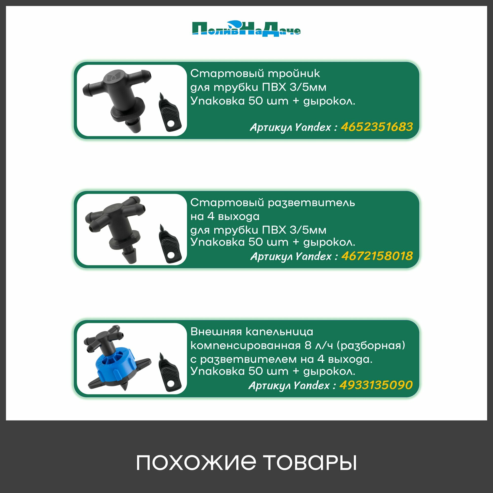 Внешняя капельница компенсированная 8 л/ч (разборная) с разветвителем на 4 выхода. Упаковка 50 шт + дырокол.