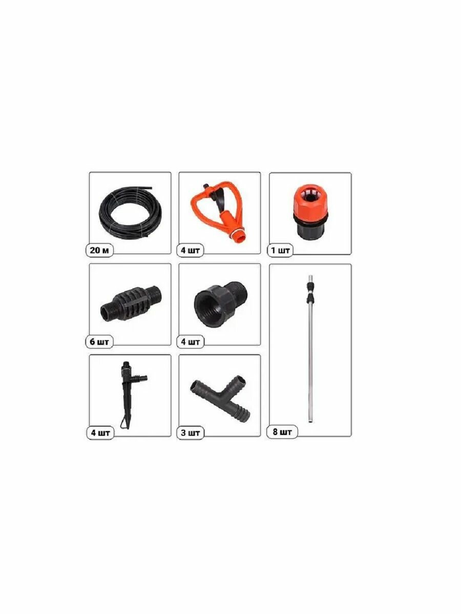 | Комплектация | шланг магистральный 1/2 - 20 метров. Цанговый зажим 1/2 - 1 шт. Распылитель - 4 шт. Гайка распылителя - 4 шт. Соединительная муфта - 4 шт. Алюминиевый удлинитель - 8шт. Ножка распылителя - 4шт. Тройник 1/2- 3 шт. Для продления срока службы системы полива производитель рекомендует использовать - фильтр для полива "Жук" |