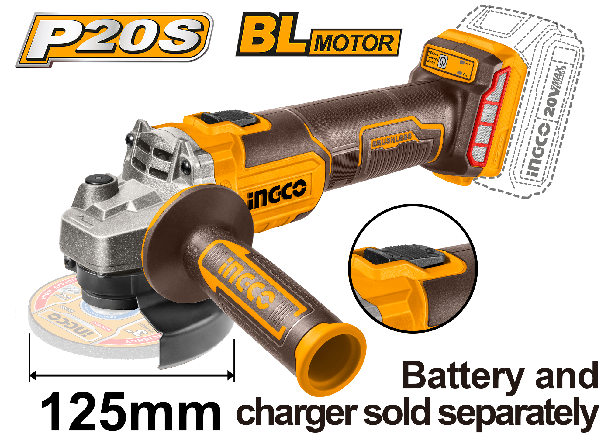 Аккумуляторная угловая шлифмашина Li-Ion 20В, Ingco CAGLI201258, BL мотор, 125мм, 8500 об/мин, без акк