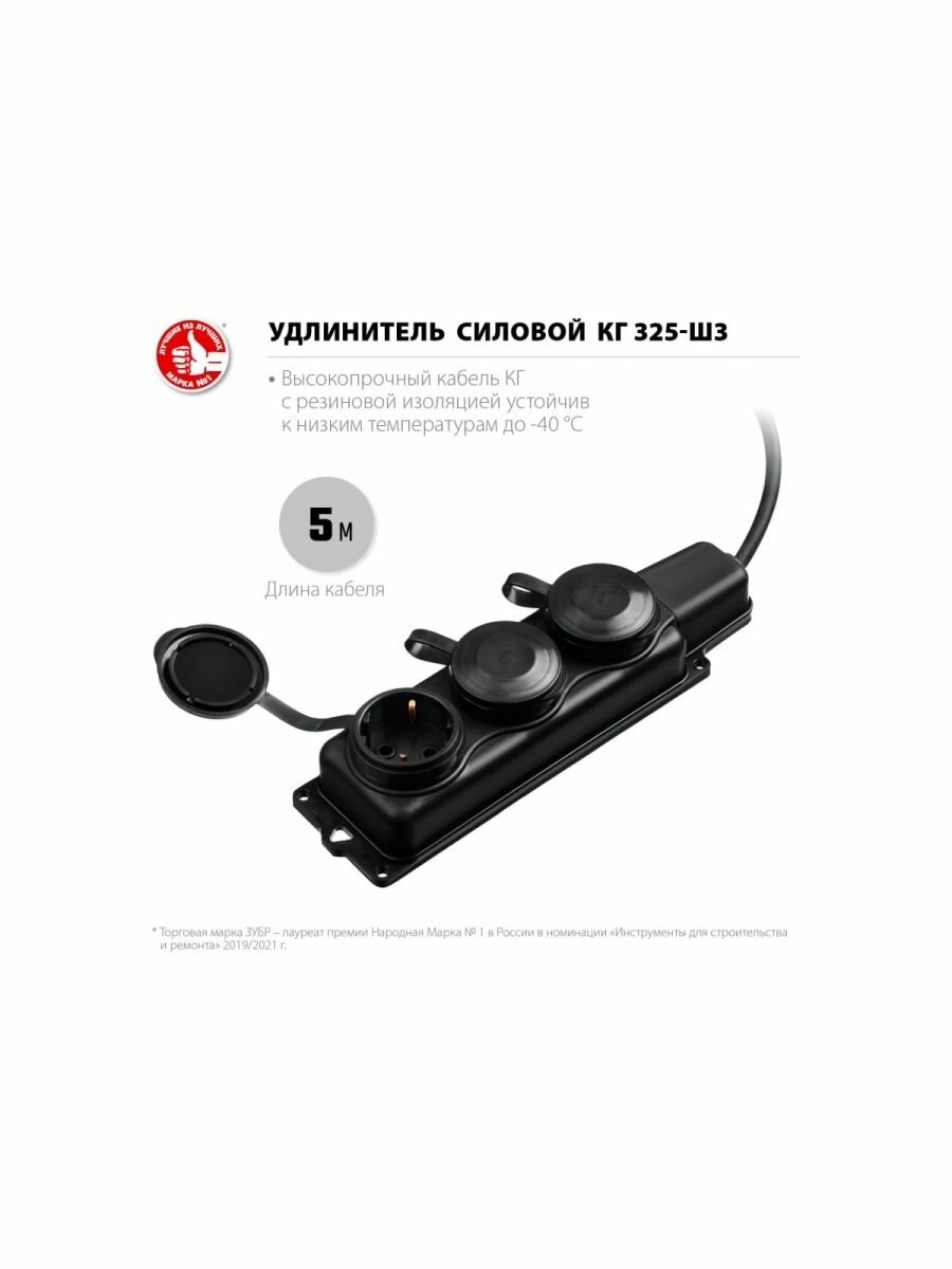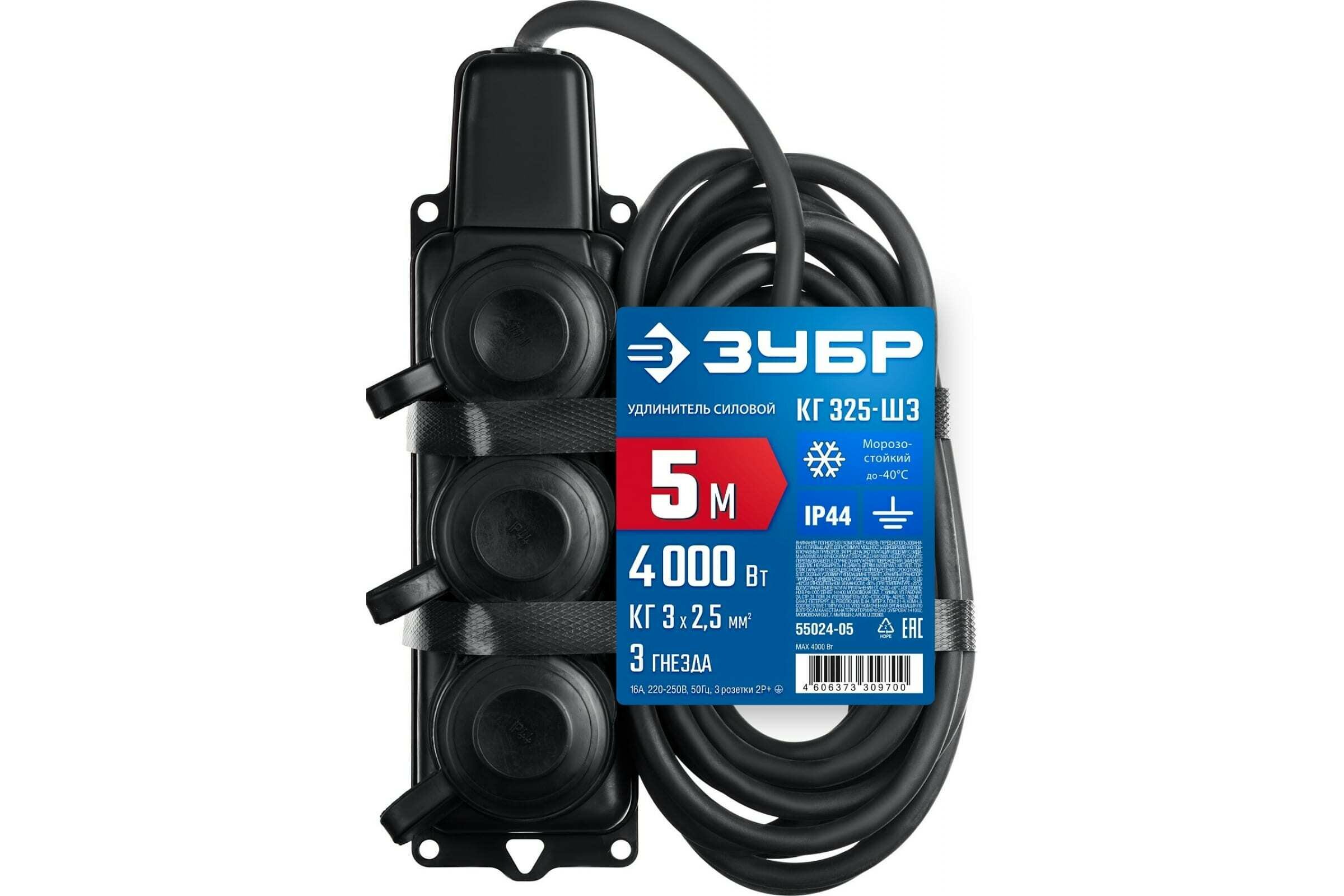 Удлинитель с колодкой, 3 гнезда, силовой, провод КГ 3х2,5 мм2 Зубр серия "профессионал", 55024-05 интересное: