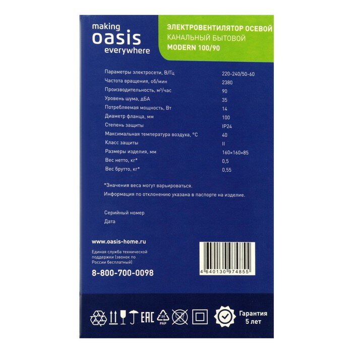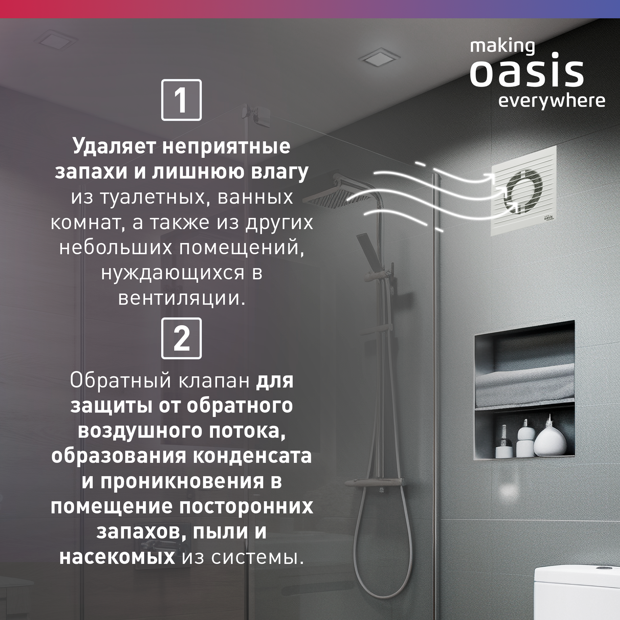 Вентилятор вытяжной Oasis Modern 100/90, d=100 мм, 14 Вт, 35 дБ, 90 м³/ч, обрат клапан интересное: