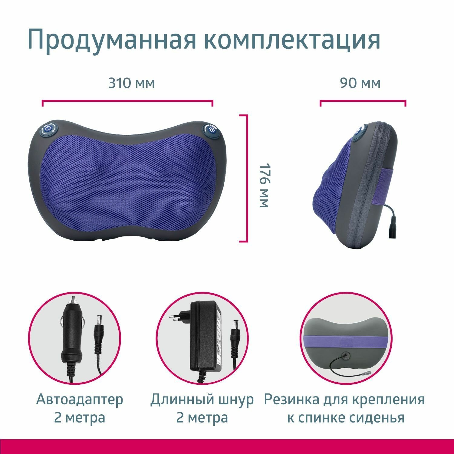 | Комплектация | "Массажер подушка – 1 шт. Адаптер от сети – 1 шт. Адаптер от авто – 1 шт. Руководство по эксплуатации с гарантийным талоном – 1 шт" |