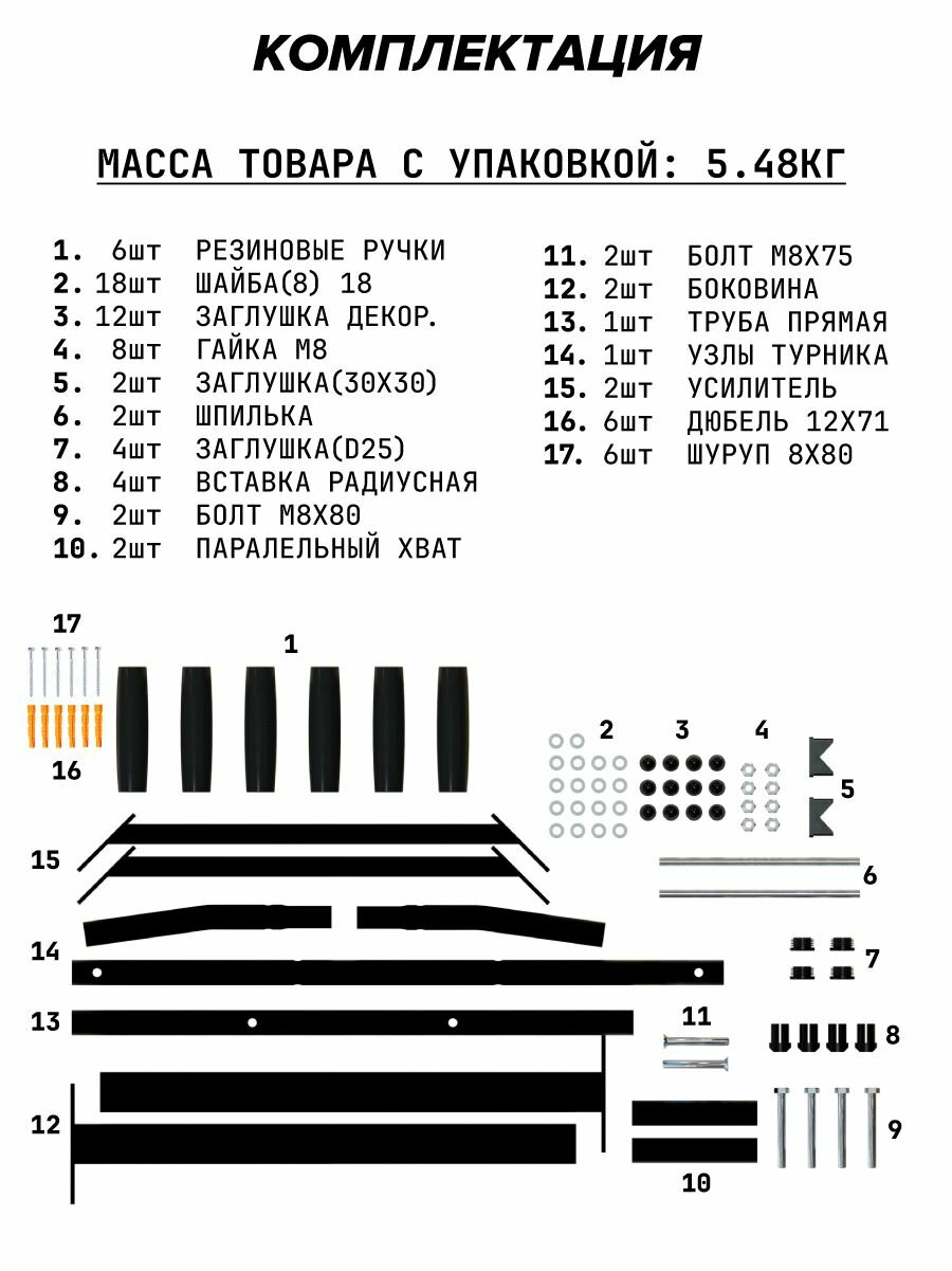 | Плюсы: | Качественный турник, хорошее крепление. В комплекте крепежный набор и комплект заглушек. |