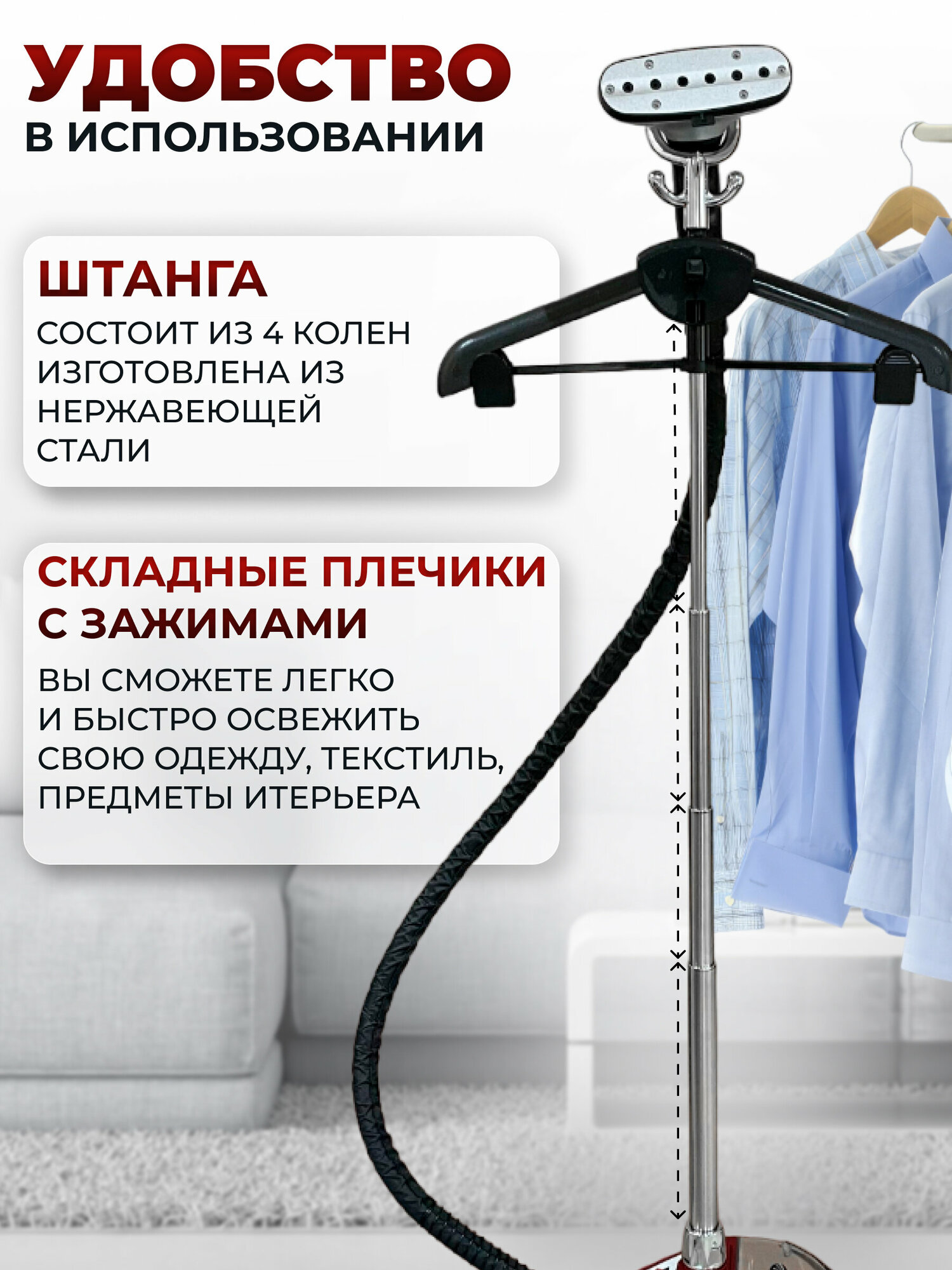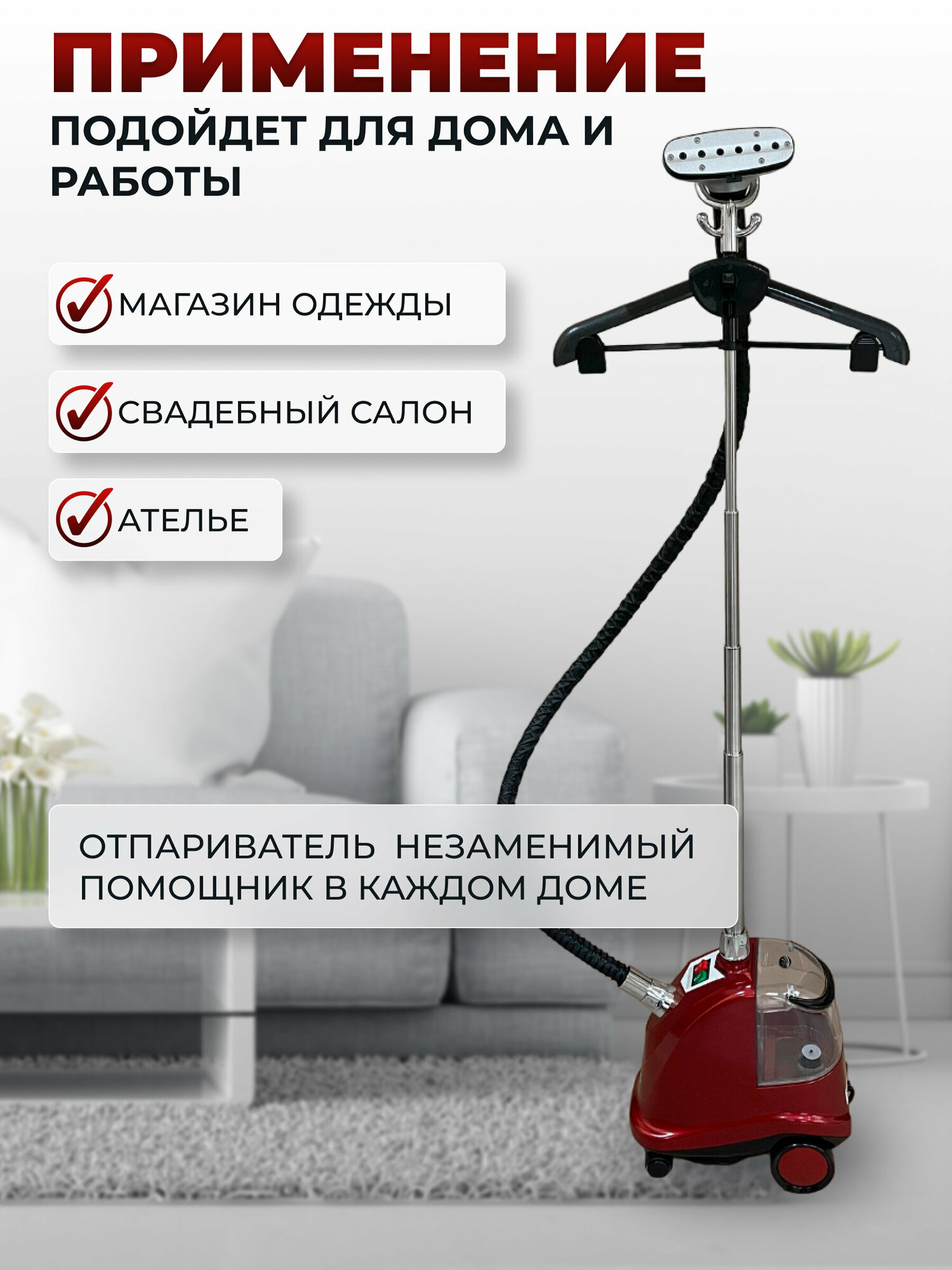 Вертикальный отпариватель - парогенератор напольный с вешалкой, для одежды, штор, тканей, покрывал, меховых изделий, красный. интересное: