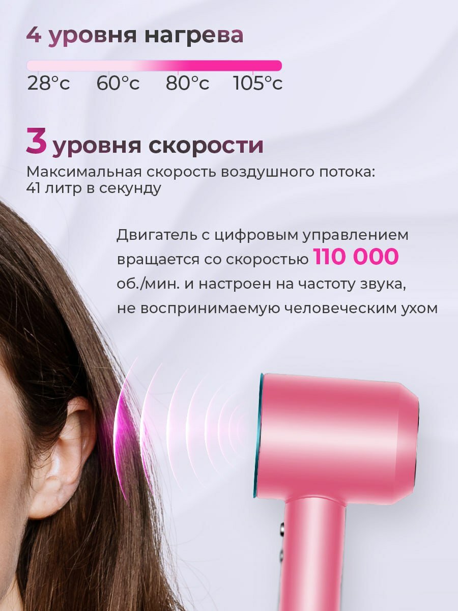 Купить Профессиональный фен для волос iHair-1600 Super Hair Dryer 1600 Вт, 3 режима, 5 магнитных насадок, ионизация воздуха, нежно-розовый