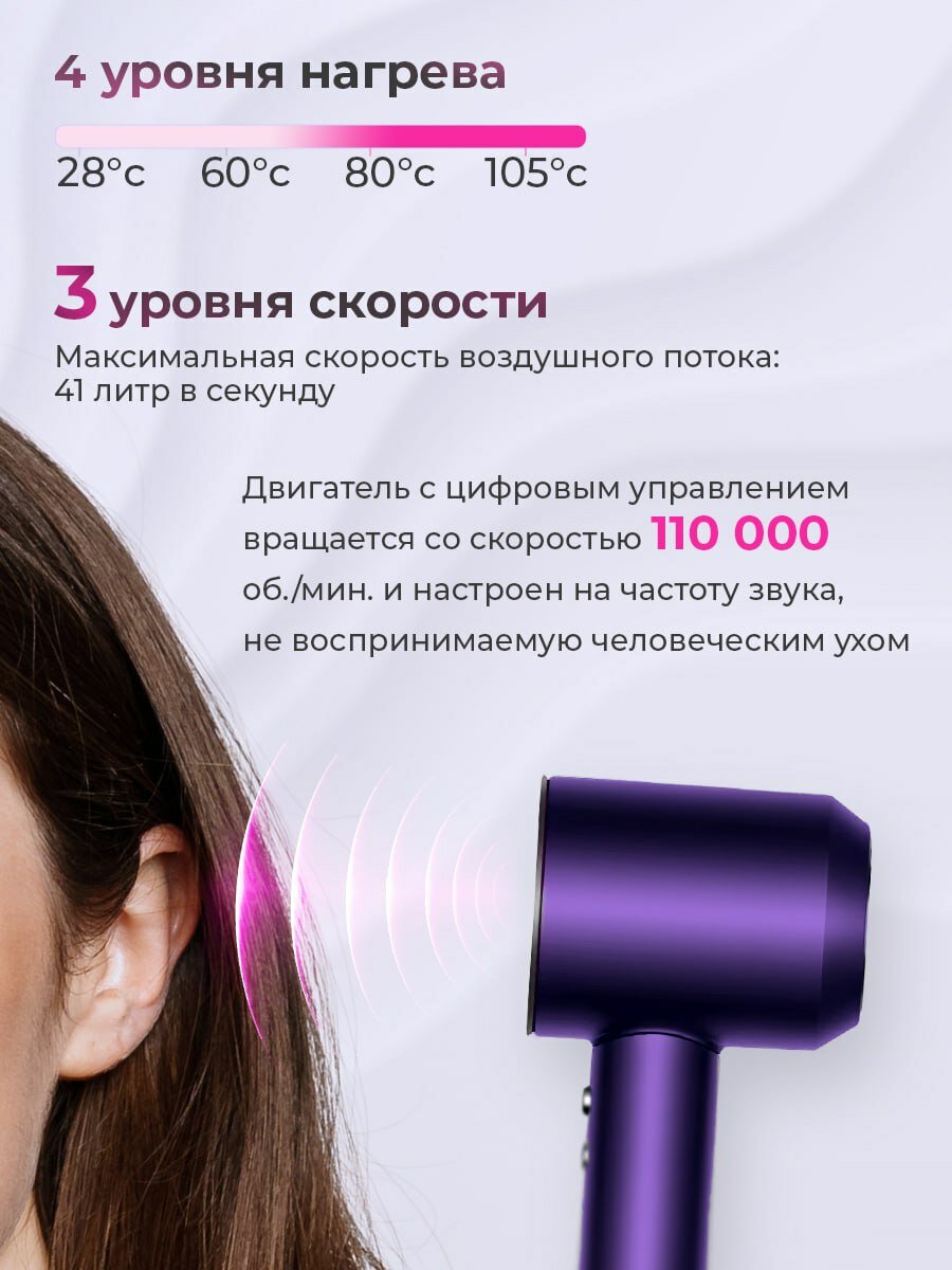 Купить Профессиональный фен для волос iHair-1600 Super Hair Dryer 1600 Вт, 3 режима, 5 магнитных насадок, ионизация воздуха, пурпурный