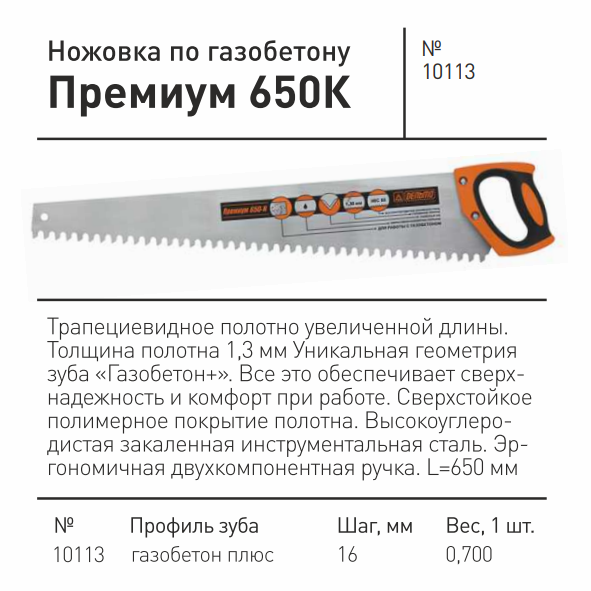 | Дополнительная информация | Ножовка по газобетону Премиум 650 мм |