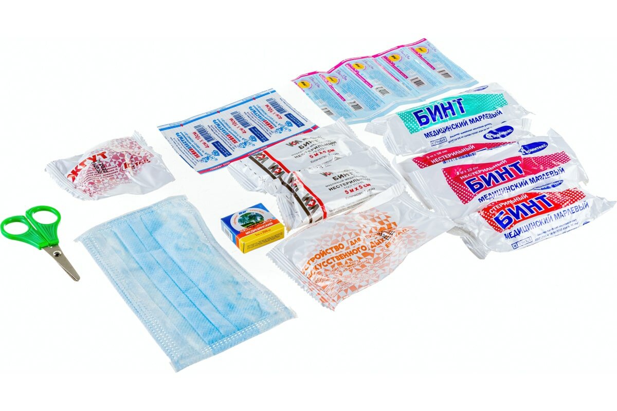 | Состав | 1.1 Жгут кровоостанавливающий – 1 шт. 1.2 Бинт марлевый медицинский нестерильный (5 м х 5 см) – 2 шт. 1.3 Бинт марлевый медицинский нестерильный (5 м х 7 см) – 1 шт. 1.4 Бинт марлевый медицинский нестерильный (5 м х 10 см) – 3 шт. 1.5 Бинт марлевый медицинский стерильный (5 м х 7 см) – 2 шт. 1.6 Бинт марлевый медицинский стерильный (5 м х 10 см) – 1 шт. 1.7 Лейкопластырь бактерицидный (не менее 4 см х 10 см) – 1 шт. 1.8 Лейкопластырь бактерицидный (не менее 1.9 см х 7.2 см) – 5 шт. 1.9 Лейкопластырь рулонный (не менее 1см х 250см) - 1 шт. Средства для сердечно-легочной реанимации 2.1 Устройства для проведения искусственного дыхания «Рот-Устройства-Рот» - 1 шт. Прочие средства 3.1 Ножницы – 1 шт. 3.2 Перчатки медицинские (размер не менее М) – 1 пара 3.3 Маска медицинская - 1 шт. 3.4 Рекомендации по применению аптечки первой помощи (автомобильной) – 1 шт. 3.5 Футляр – 1 шт. |