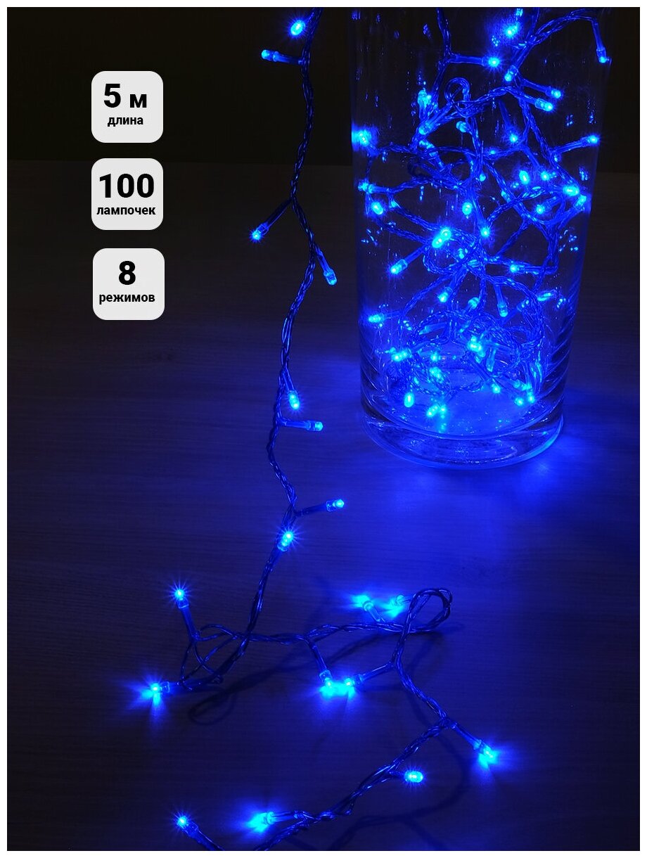 Гирлянда нить 100 светодиодов, 5 метров, синий провод, IP20