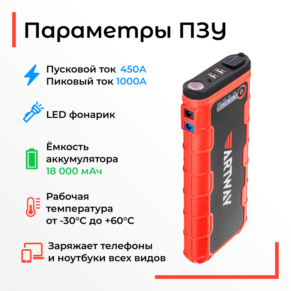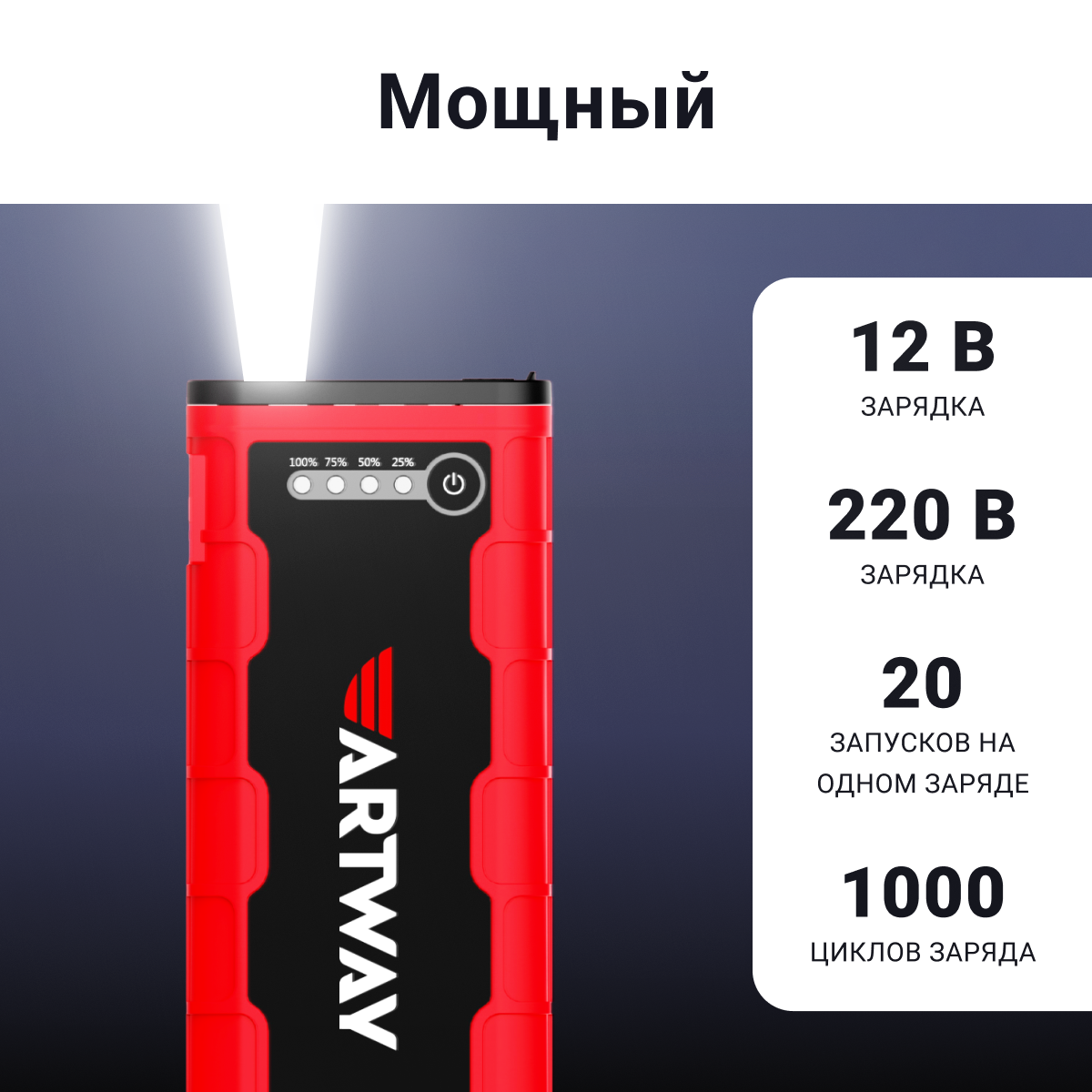 Пуско зарядное устройство Artway JS-1016 для автомобиля, портативное ПЗУ с LED фонарем и беспроводной зарядкой на 16000 мАч