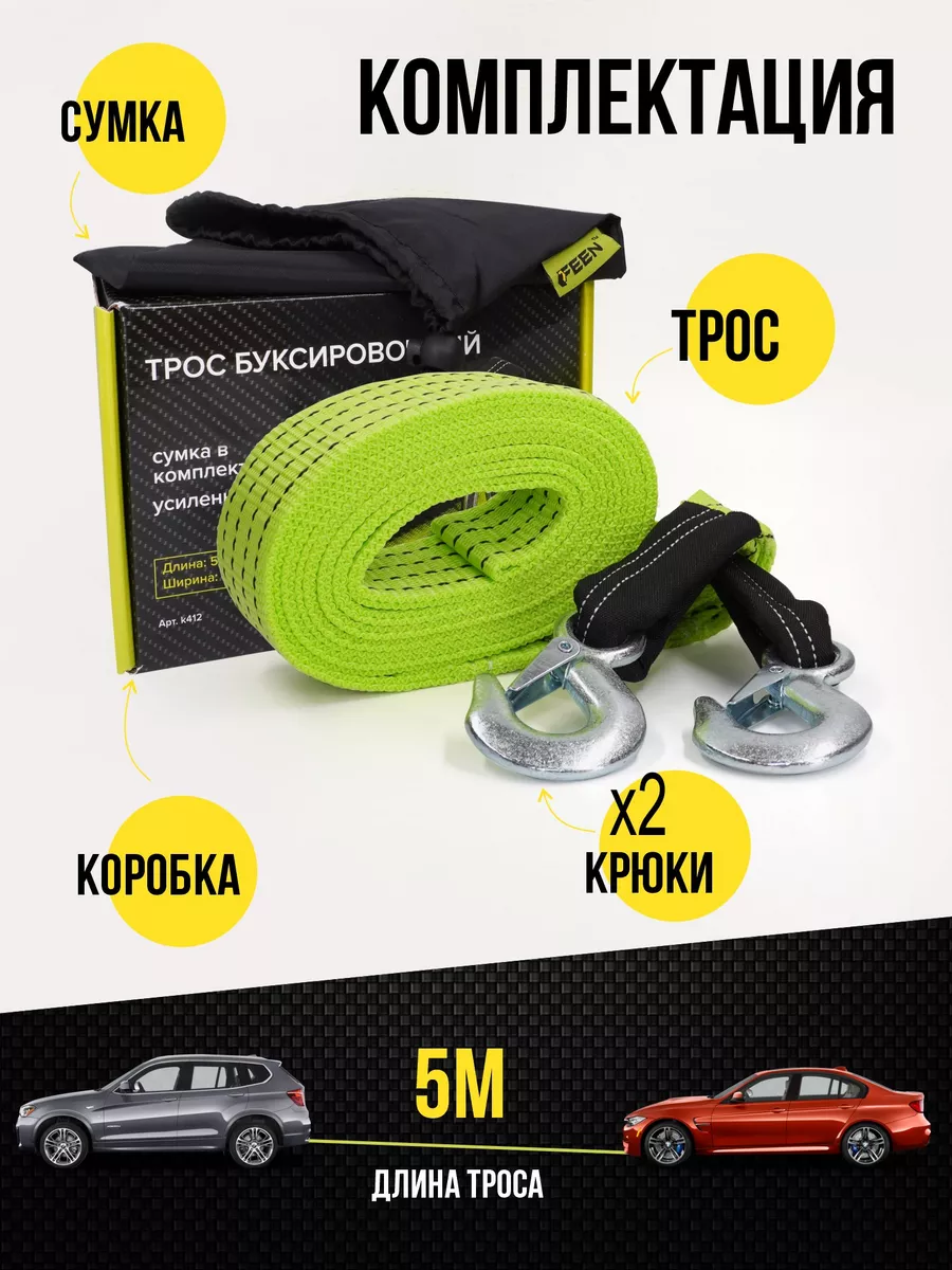 Купить Трос буксировочный для автомобиля FEEN на 12 т, с крюкам с рабочей нагрузкой до 5 т, 5 метров