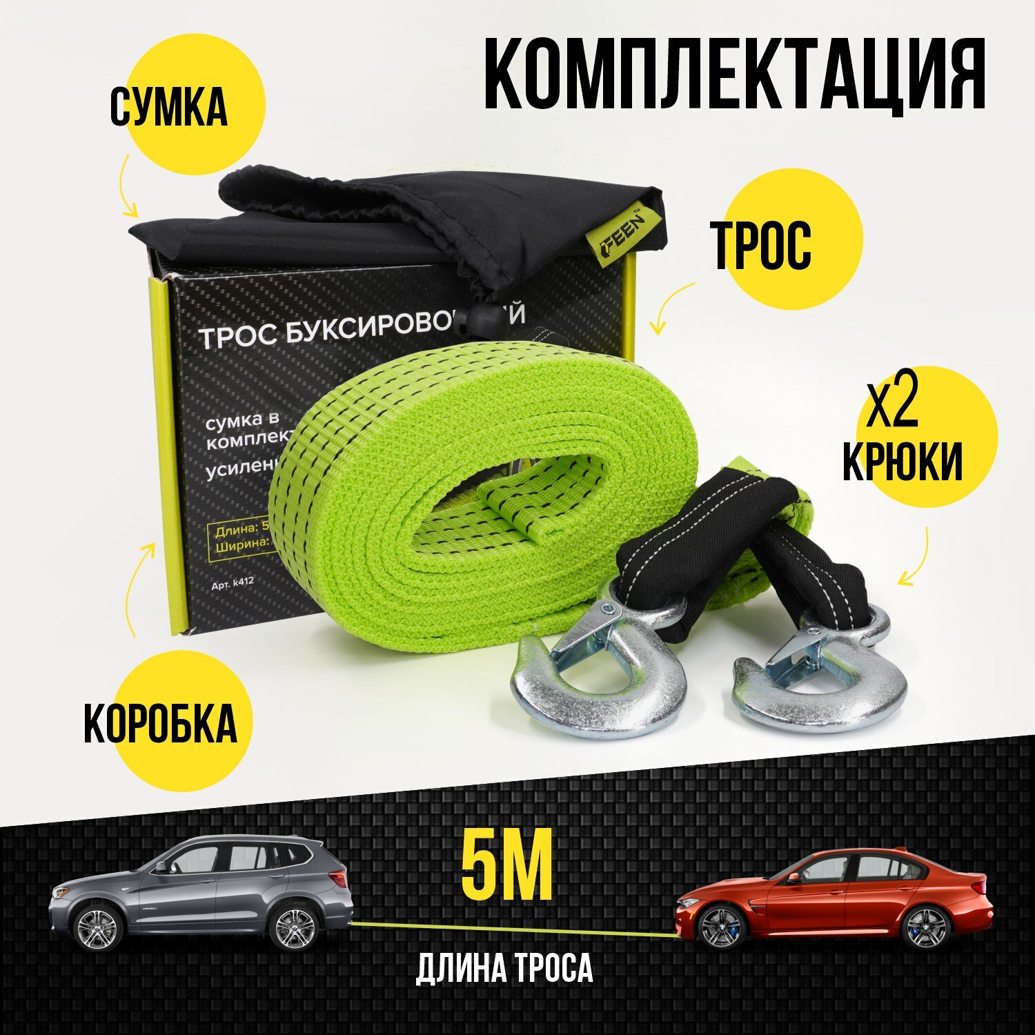 Трос буксировочный для автомобиля FEEN на 12 т, с крюкам с рабочей нагрузкой до 5 т, 5 метров