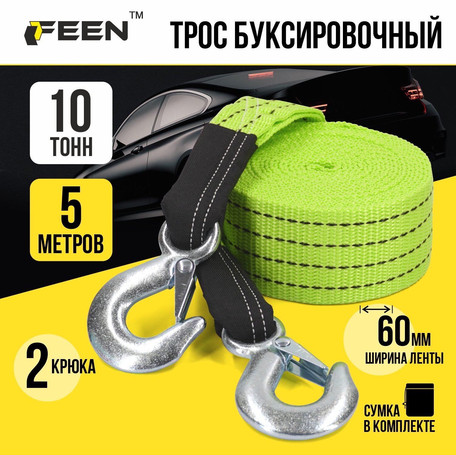 Купить Трос буксировочный для автомобиля FEEN на 10 т, с крюкам с рабочей нагрузкой до 4 т, 5 метров