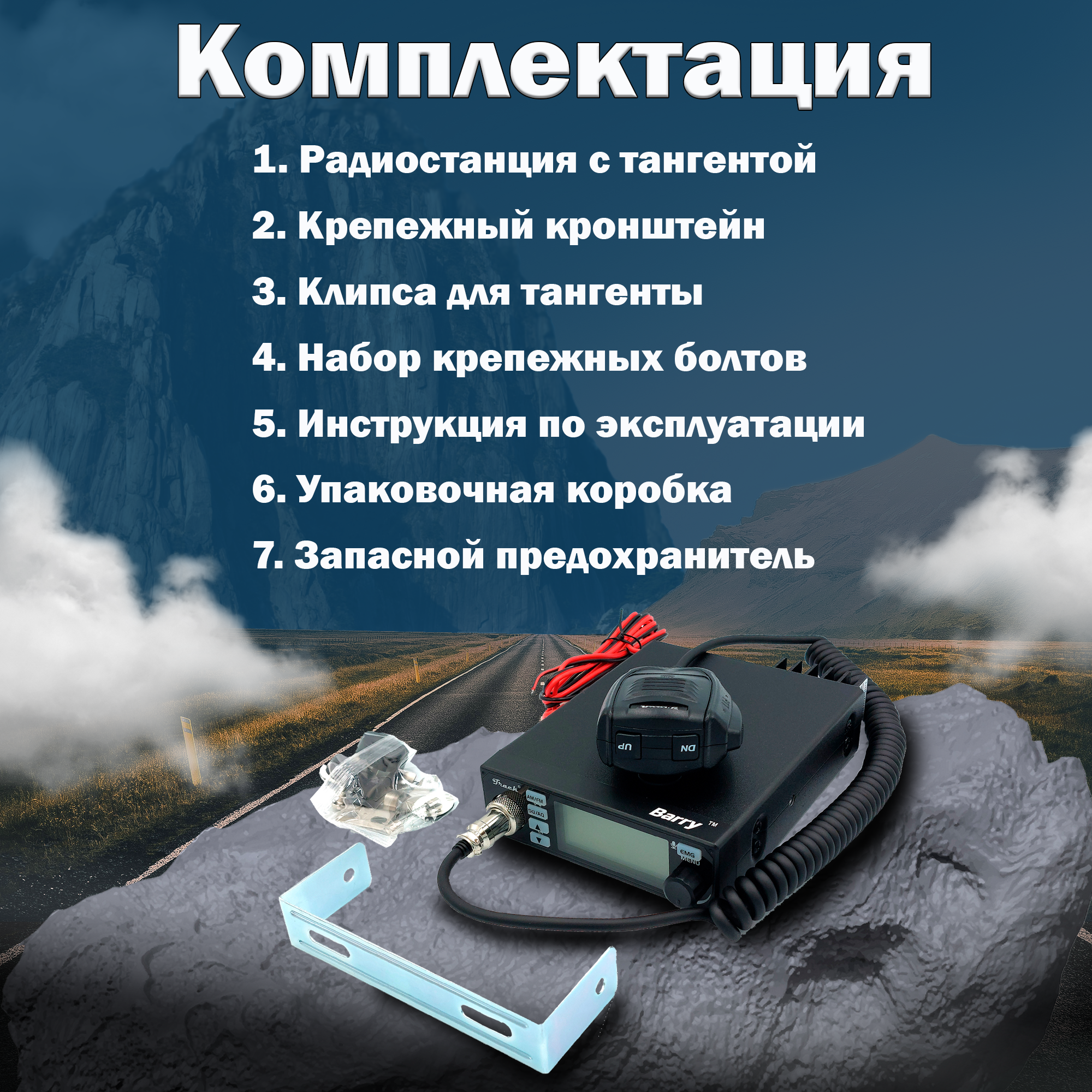 | Комплектация | Радиостанция Track Barry, Тангента, Крепежный кронштейн, Клипса для установки тангенты, Комплект крепежных болтов, Запасной предохранитель, Руководство пользователя. Упаковочная коробка. |