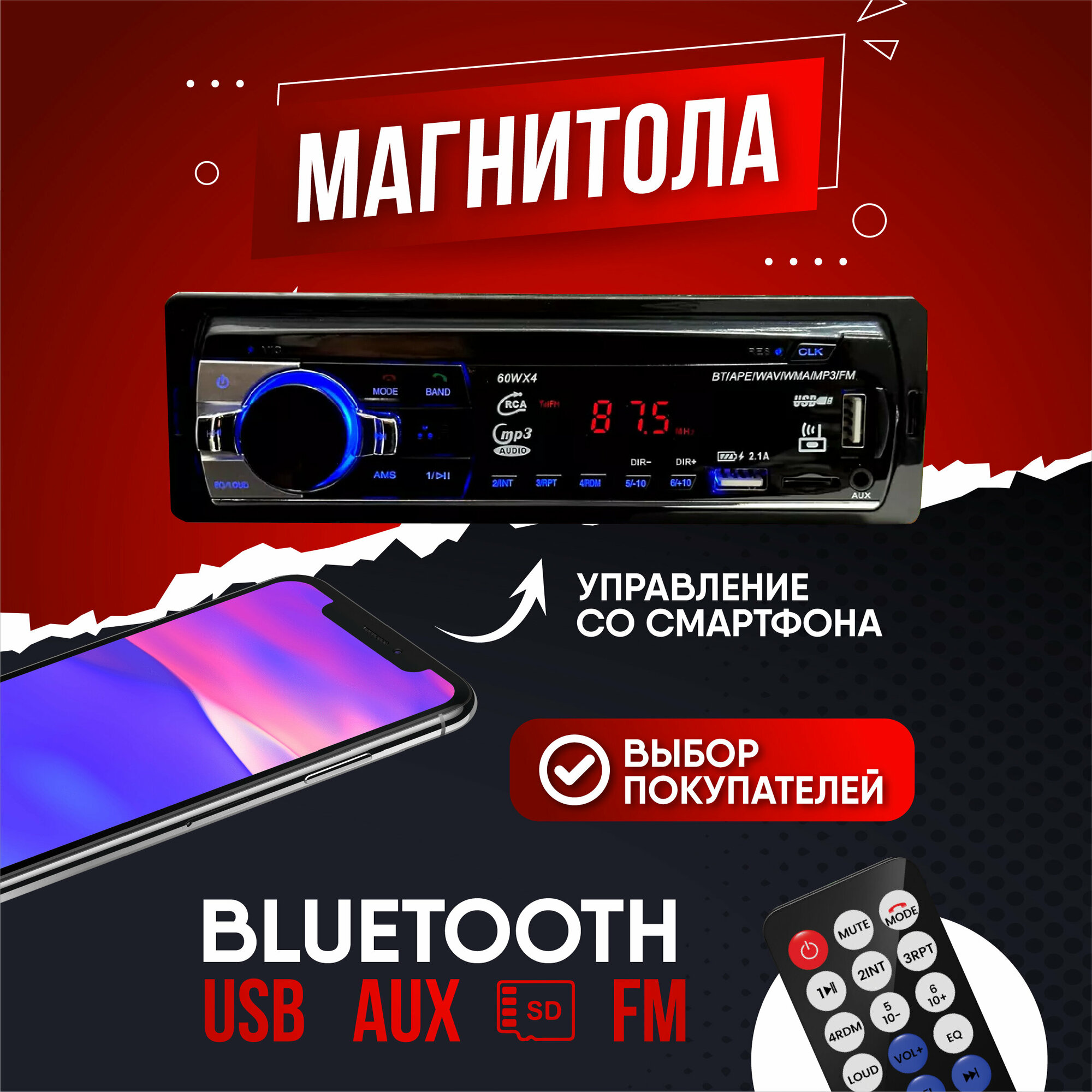 Купить Автомагнитола 1 DIN, Bluetooth, AUX, USB