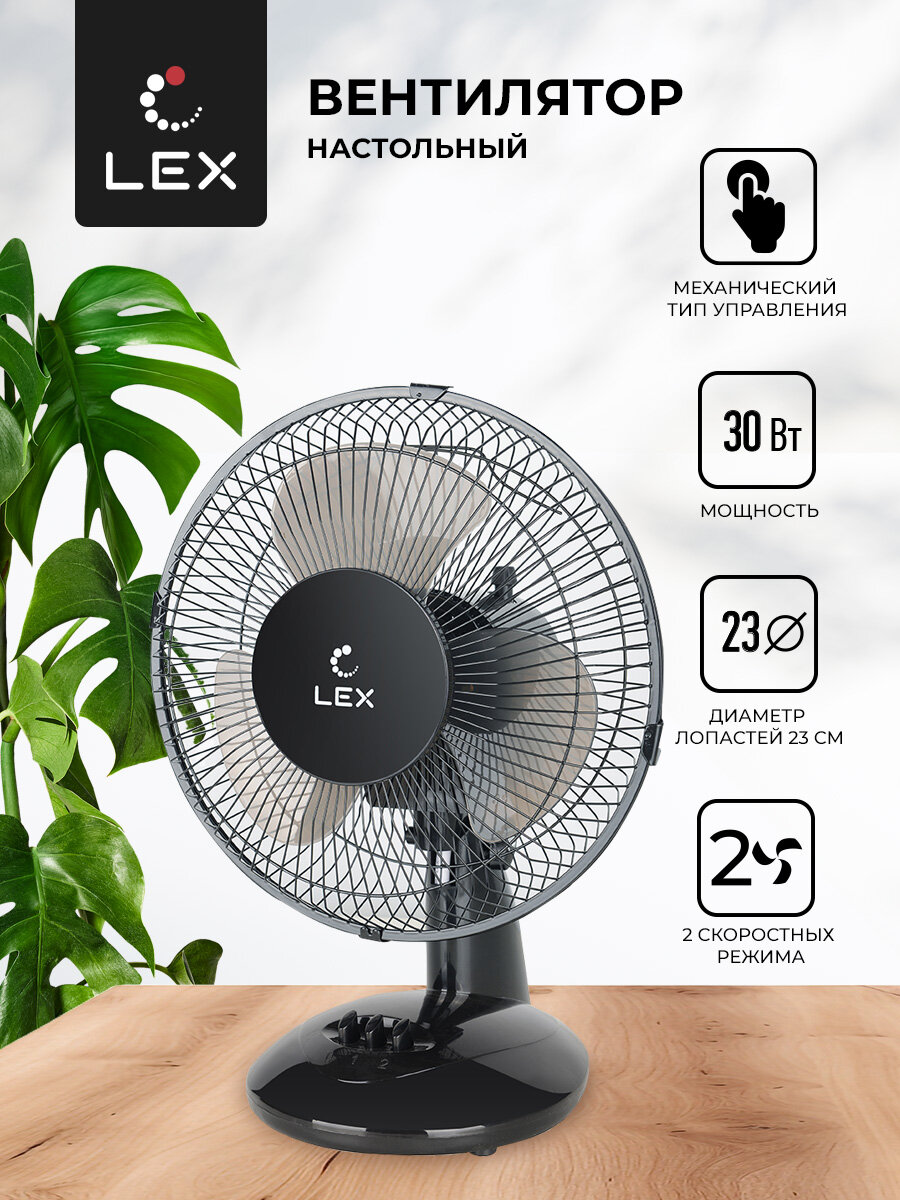 Вентилятор настольный LEX LXFC 8378, Мощность 30 Вт, размер лопастей 23 см, тип управления механический, 2 скорости вращения, поворот корпуса на 90*.