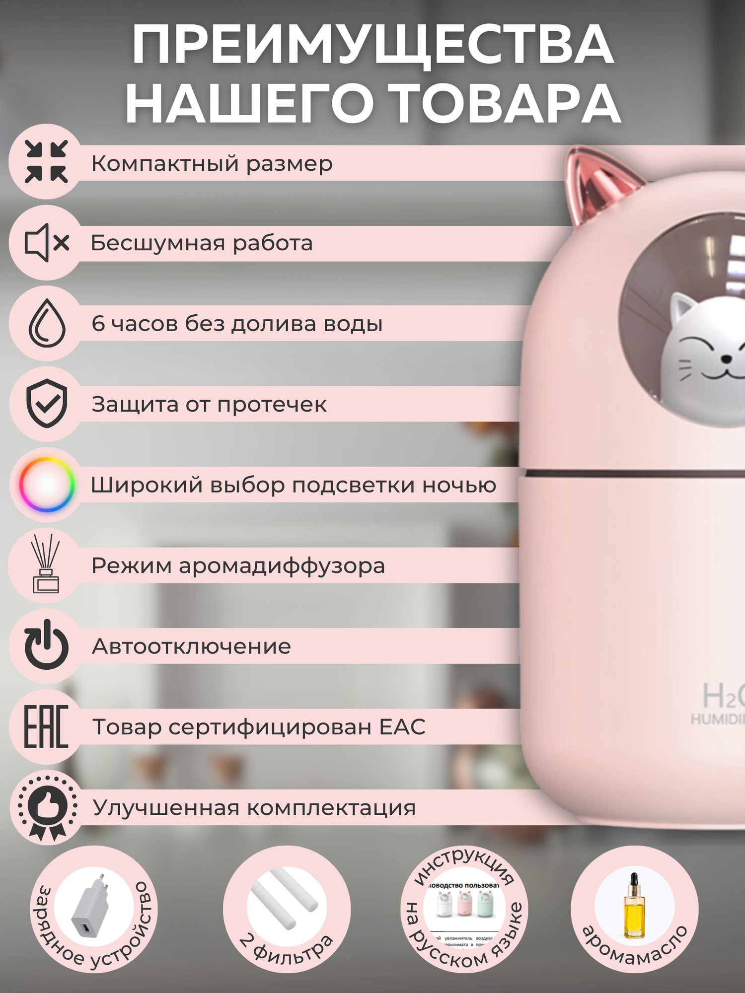 | Подробная комплектация | увлажнитель воздуха, зарядное устройство, кабель зарядки, фильтр основной и дополнительный (2 шт.), флакон аромамасла (10 мл), инструкция (на русском языке) |