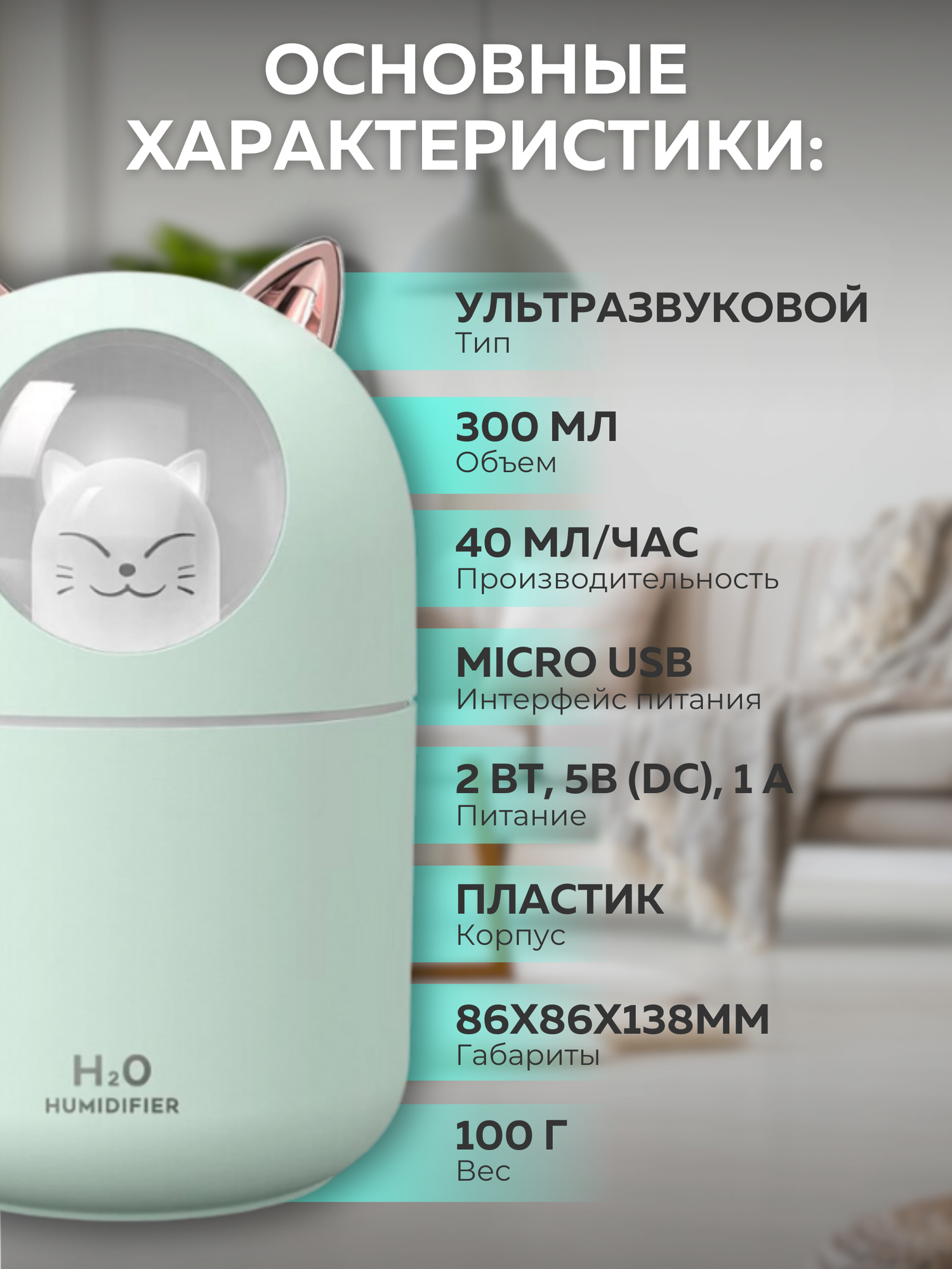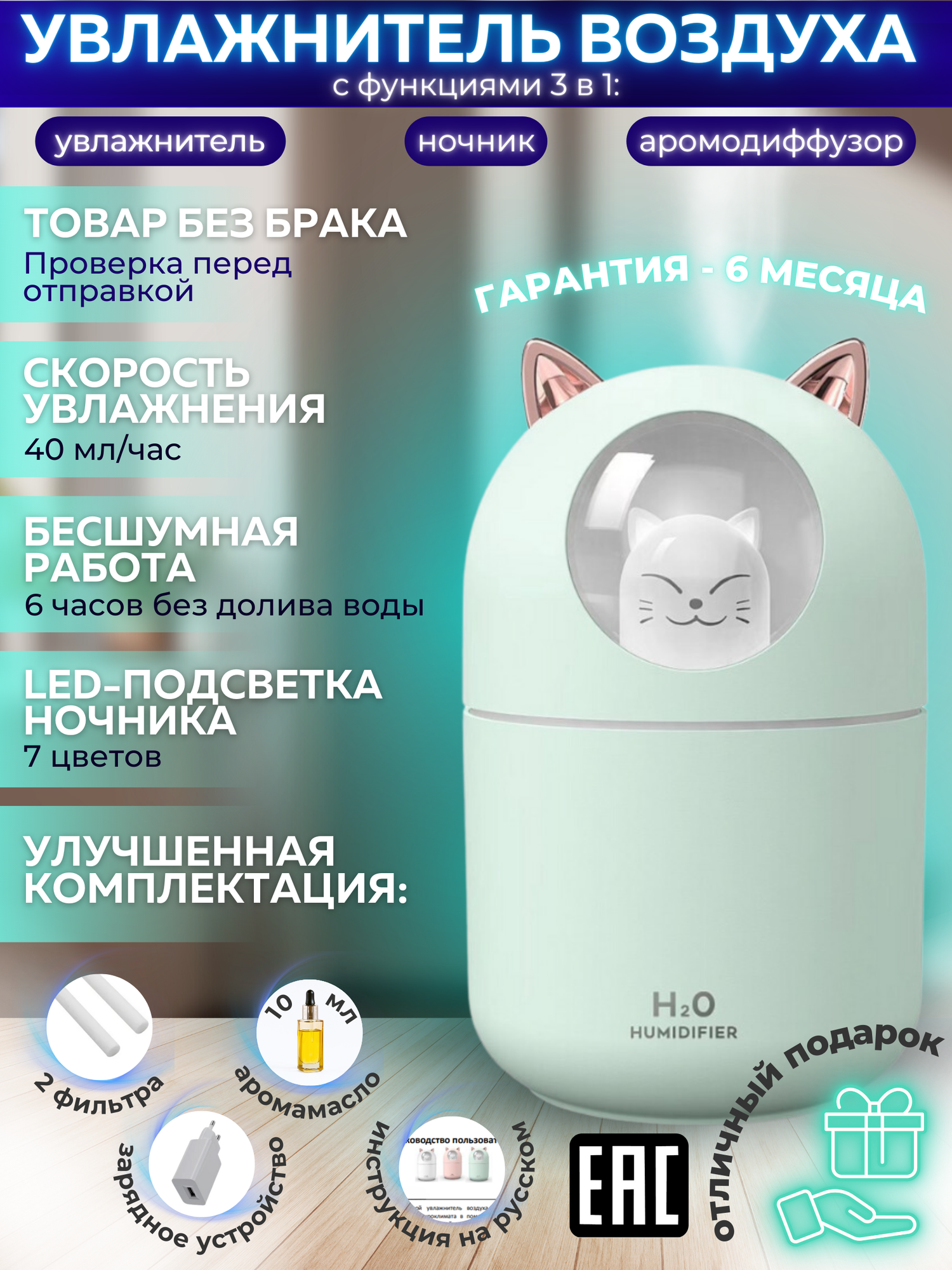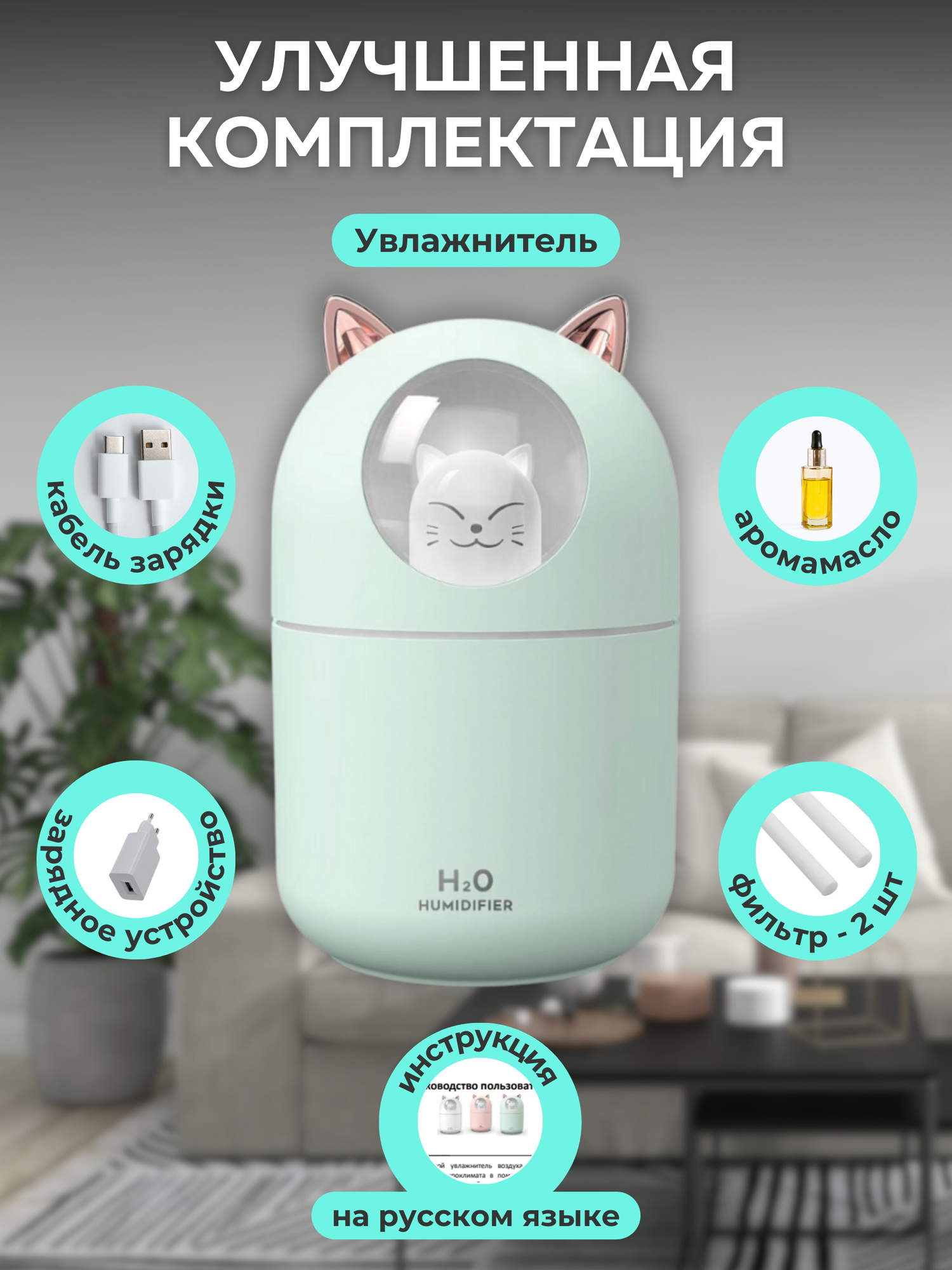 Увлажнитель воздуха ультразвуковой настольный A205 зеленый, с аромадиффузором и подсветкой, с аромамаслом и фильтрами, для дома и офиса интересное: