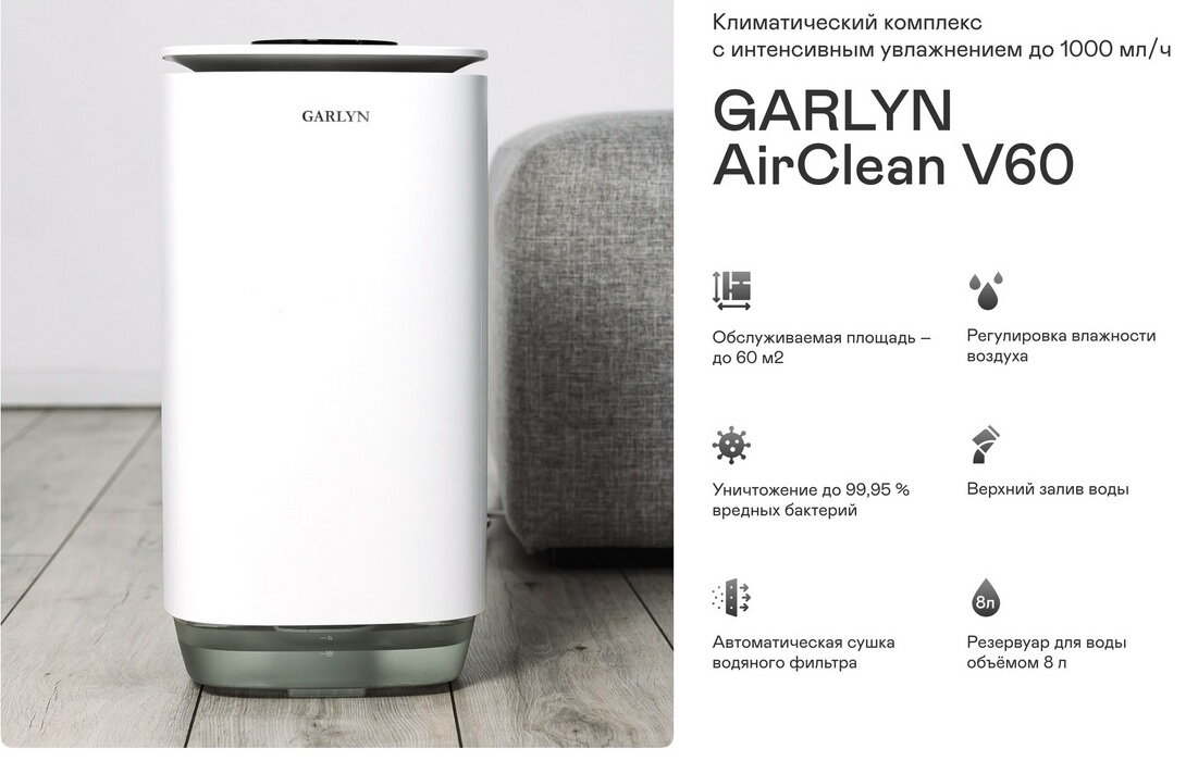 Климатический комплекс с интенсивным увлажнением GARLYN AirClean V60 интересное: