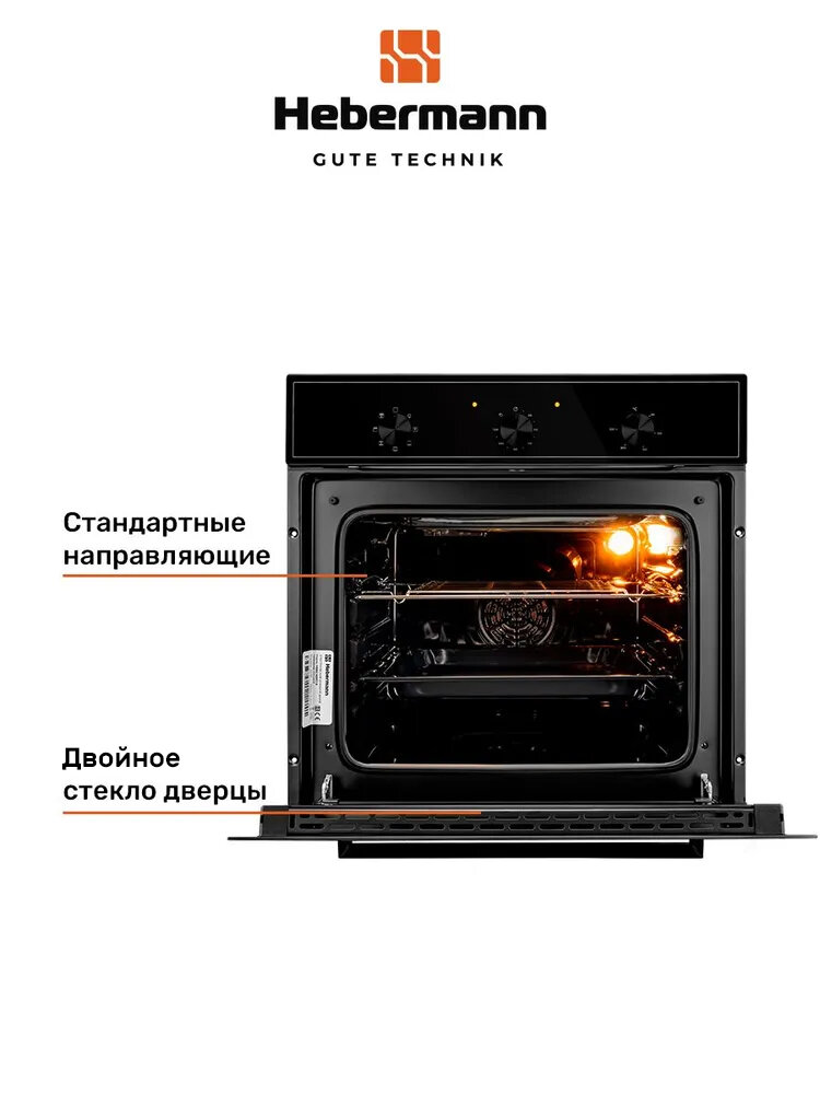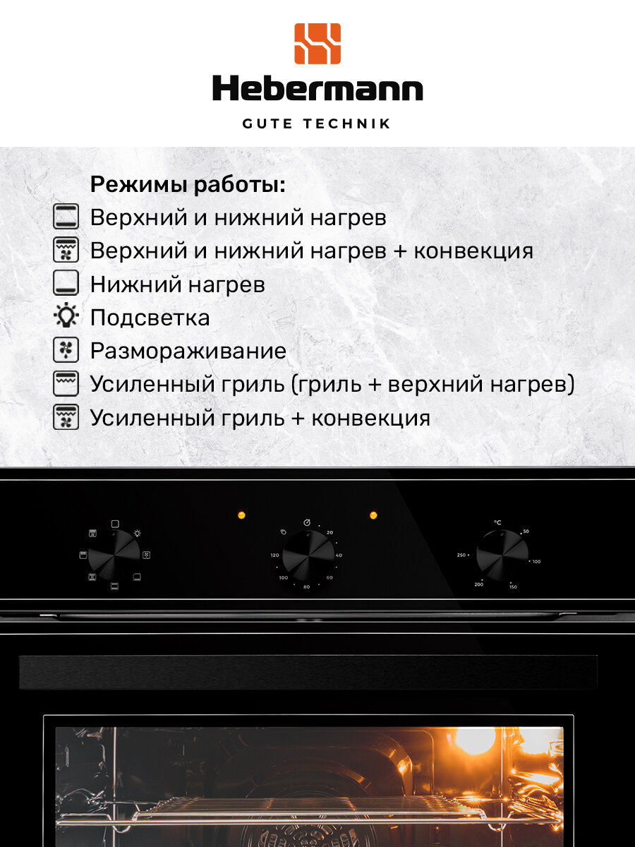 Духовой шкаф HBBO 6007.1 B, черный 6007.1 B, черный, усиленный гриль + конвекция, размораживание, 1 решетка и 1 глубокий противень, двойное стекло у дверцы, 7 режимов работы, размеры шкафа(В*Ш*Г)595*595*530 мм. отделка фасада-стекло