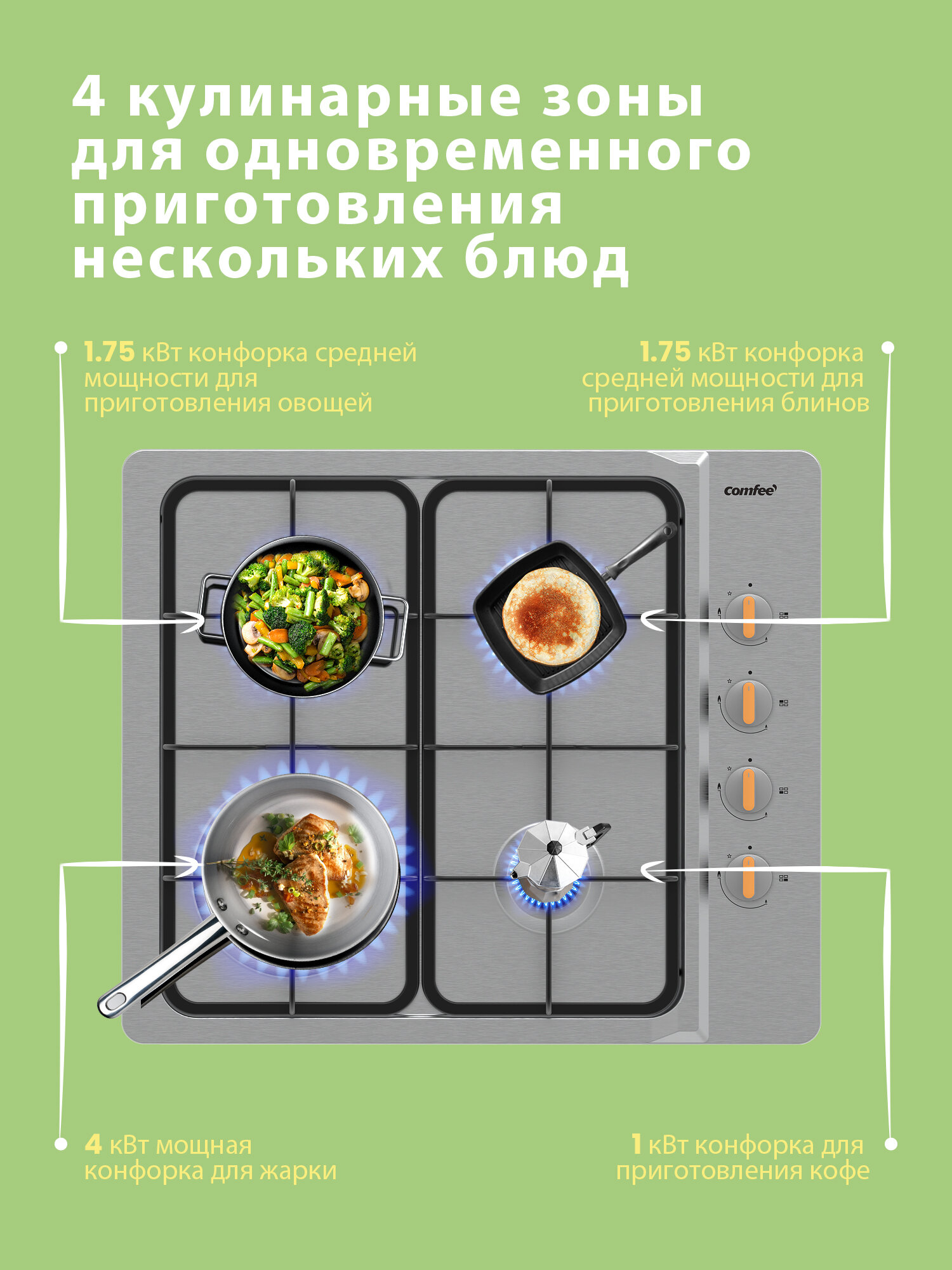Встраиваемая газовая варочная панель Comfee CGH603X, 4 конфорки, WOK, газ-контроль, электроподжиг интересное: