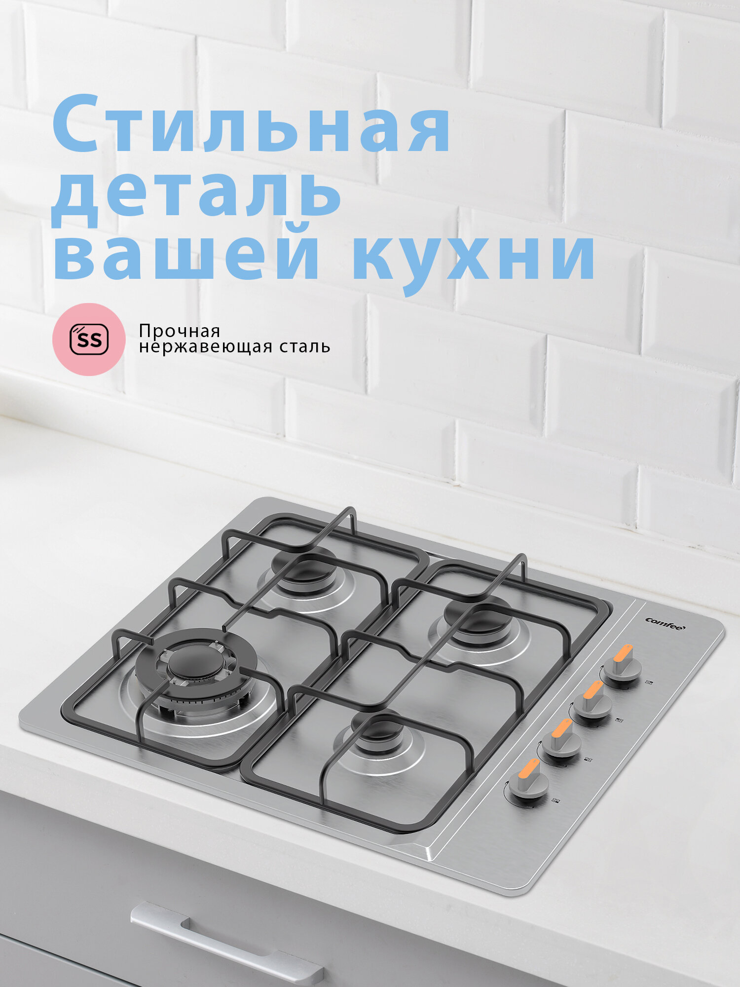 Купить Встраиваемая газовая варочная панель Comfee CGH603X, 4 конфорки, WOK, газ-контроль, электроподжиг